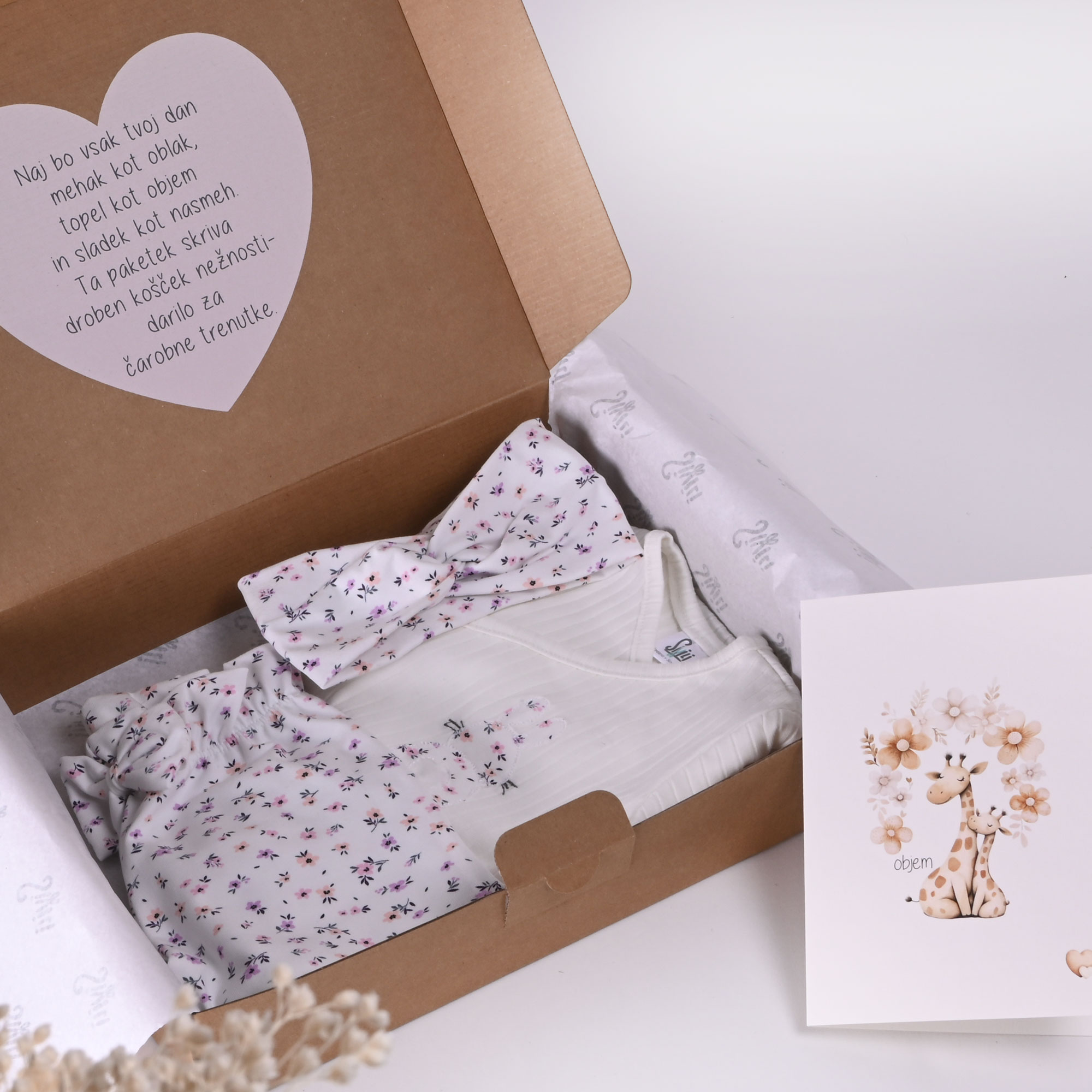 Tkanina je potiskana z nežnim motivom rožic, ki simbolizira otroško igrivost in toplino. Komplet prejmete v lični darilni embalaži, ki že na prvi pogled ustvari poseben občutek. Na notranji strani pokrova je natisnjen srček s slovenskim tekstom, kar doda osebno noto.