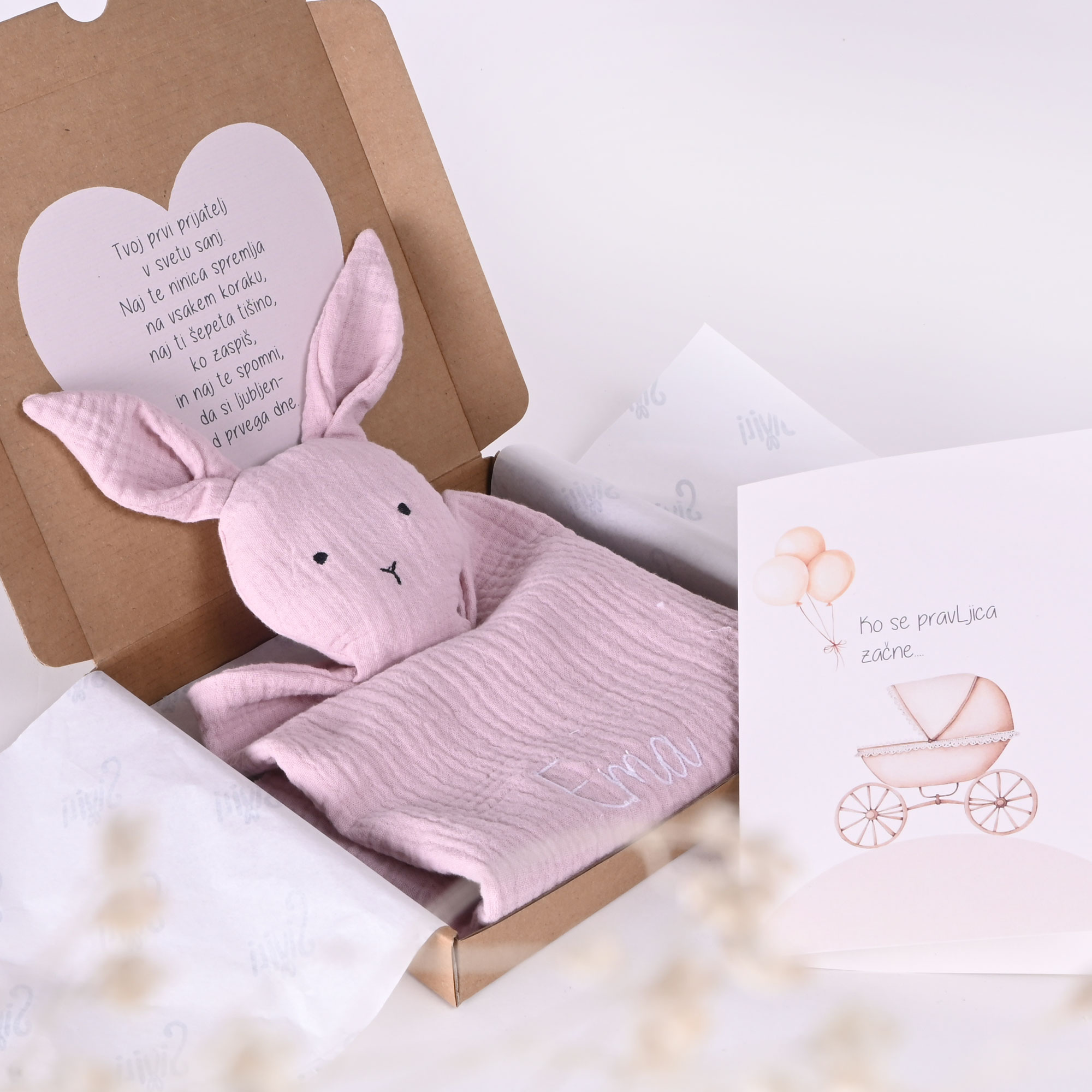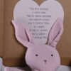 Darilni paket za novorojenčka z zajčkom v roza barvi iz muslina z vezenim imenom otroka in posvetilom na čestitki