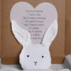 Darilni paket za novorojenčka z zajčkom v smetana barvi iz muslina z vezenim imenom otroka in posvetilom na čestitki