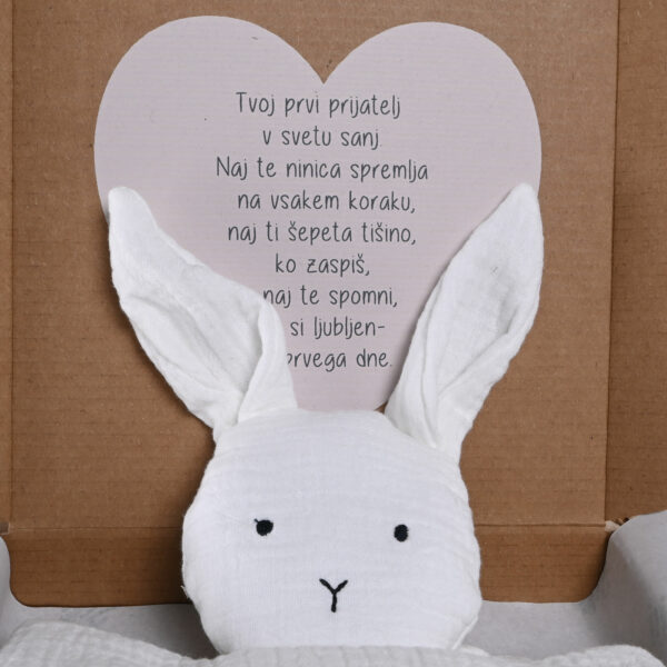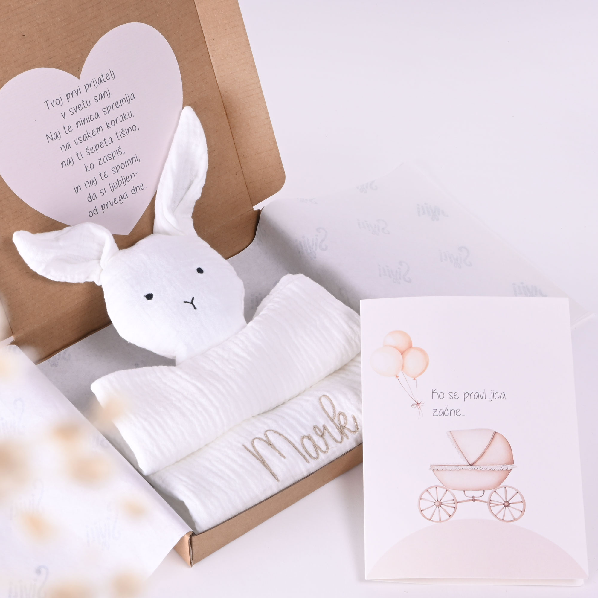 Iščete nežno in posebno darilo za novorojenčka? Ta čudovit darilni paket za novorojenčka vsebuje mehkega zajčka iz muslina, ki bo postal prvi spremljevalec dojenčka pri crkljanju in uspavanju.