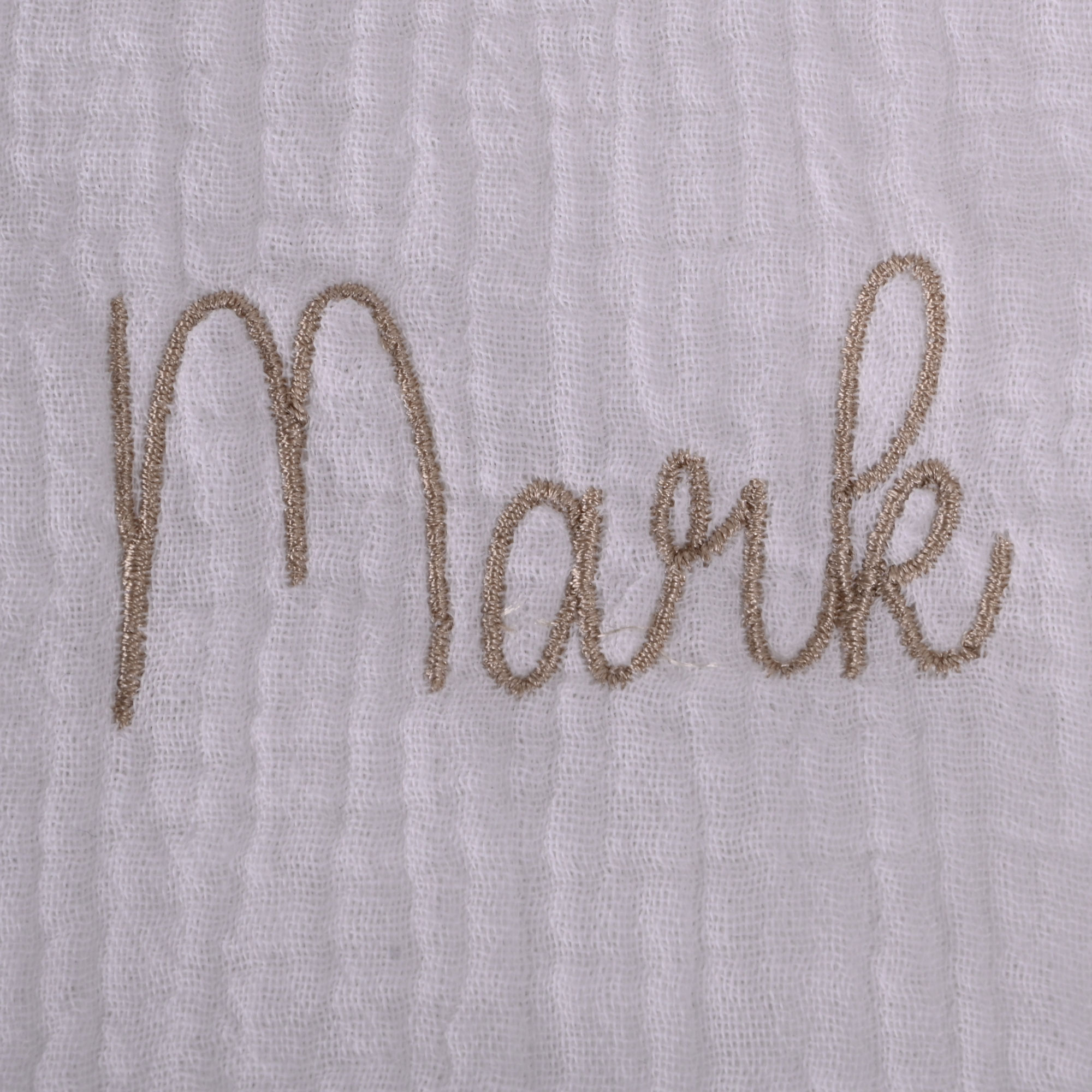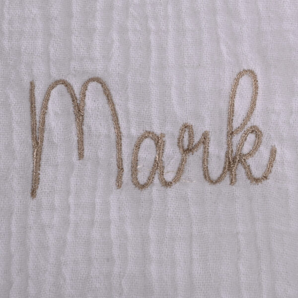 Posebno noto darilu doda tudi vezenje imena, ki ga dodamo pred zaključno izdelavi in posebna čestitka, v katero lahko napišete svoje posvetilo ali lepo željo ob rojstvu otroka.