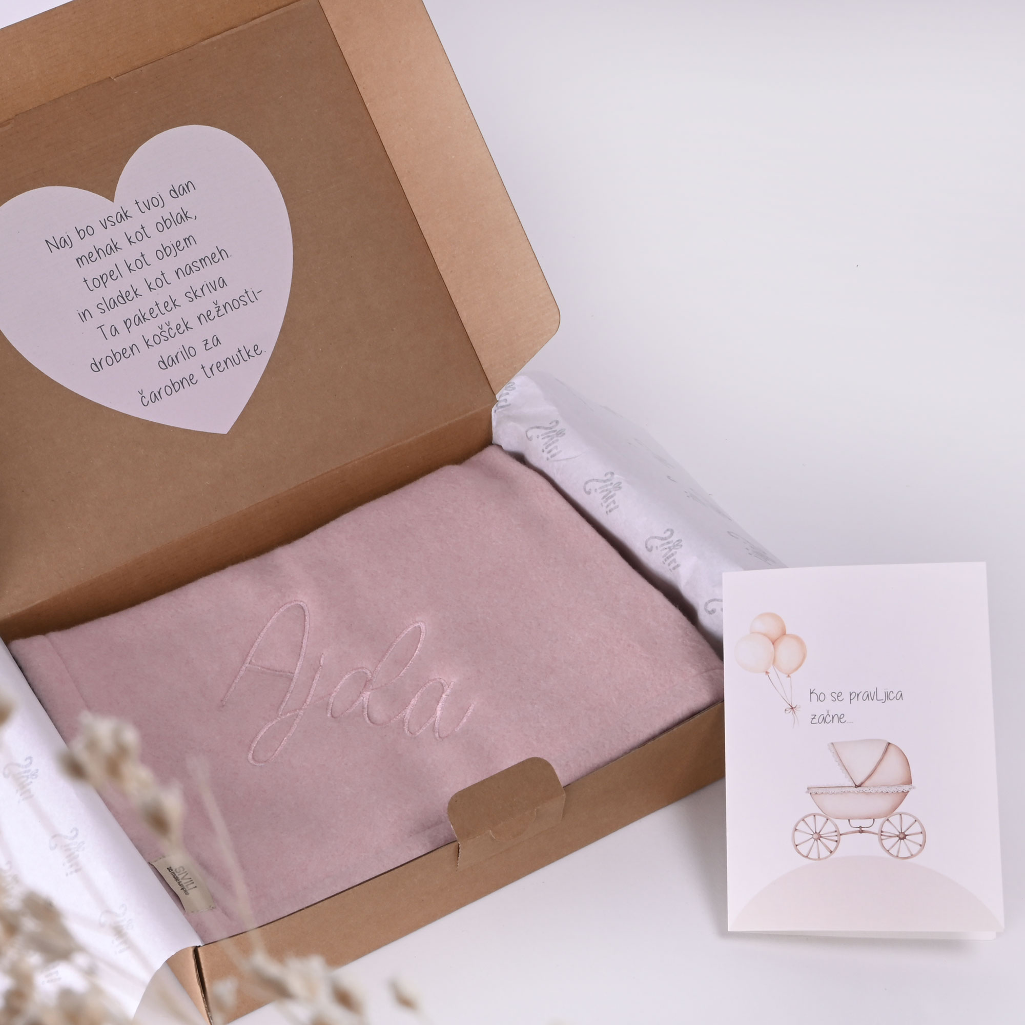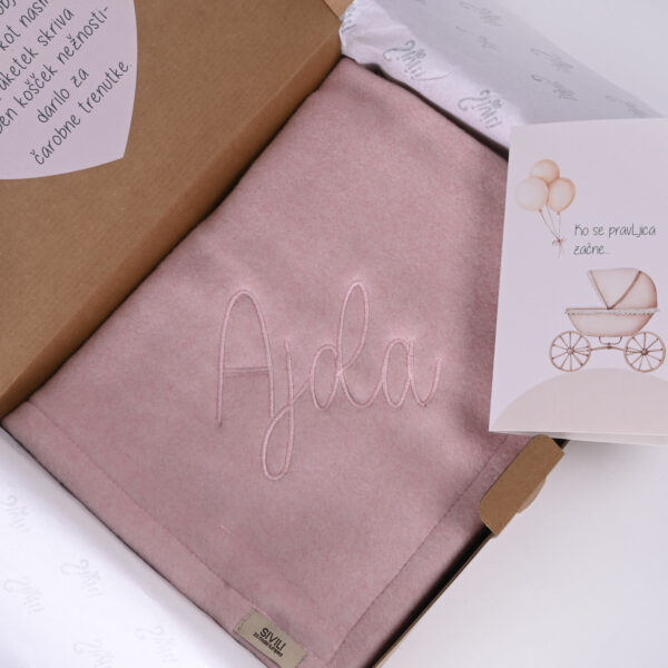 Darilni paket za novorojenčka z mehko odejo v roza barvi (70x90cm) z vezenim imenom otroka in posvetilom na čestitki