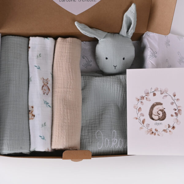 Darilni paket za novorojenčka z mehkim prvim zajčkom za tolaženje in spanje v mint barvi in treh tetra pleničk iz muslina v mint, bež in beli barvi, ki je potiskana z medvedki