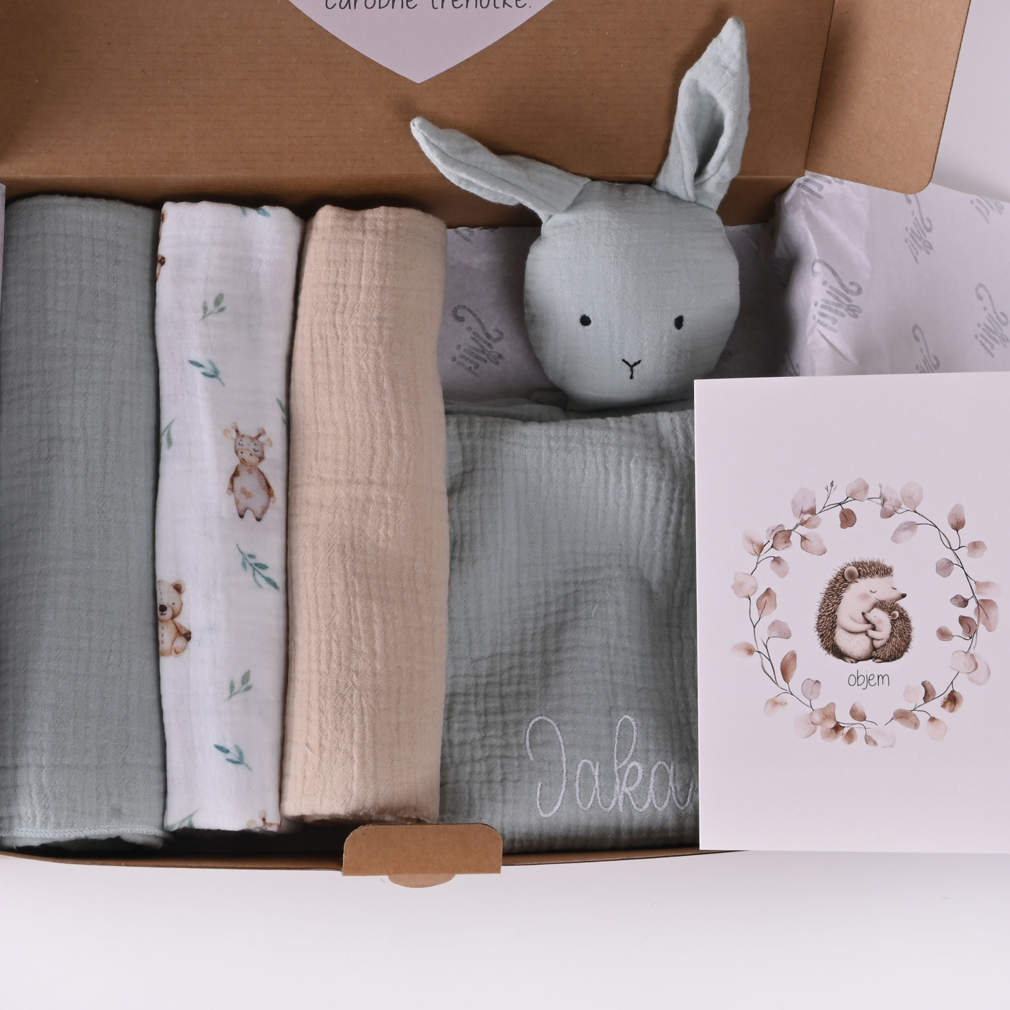Iščete nežno in posebno darilo za novorojenčka ali dojenčka? Ta čudovit darilni paket vsebuje tri različne tetra pleničke v dimenzijah 70x70cm v mint, bež in beli barvi, ki je potiskana z medvedki, ter prvega zajčka iz mehkega muslina, ki bo postal najboljši spremljevalec.