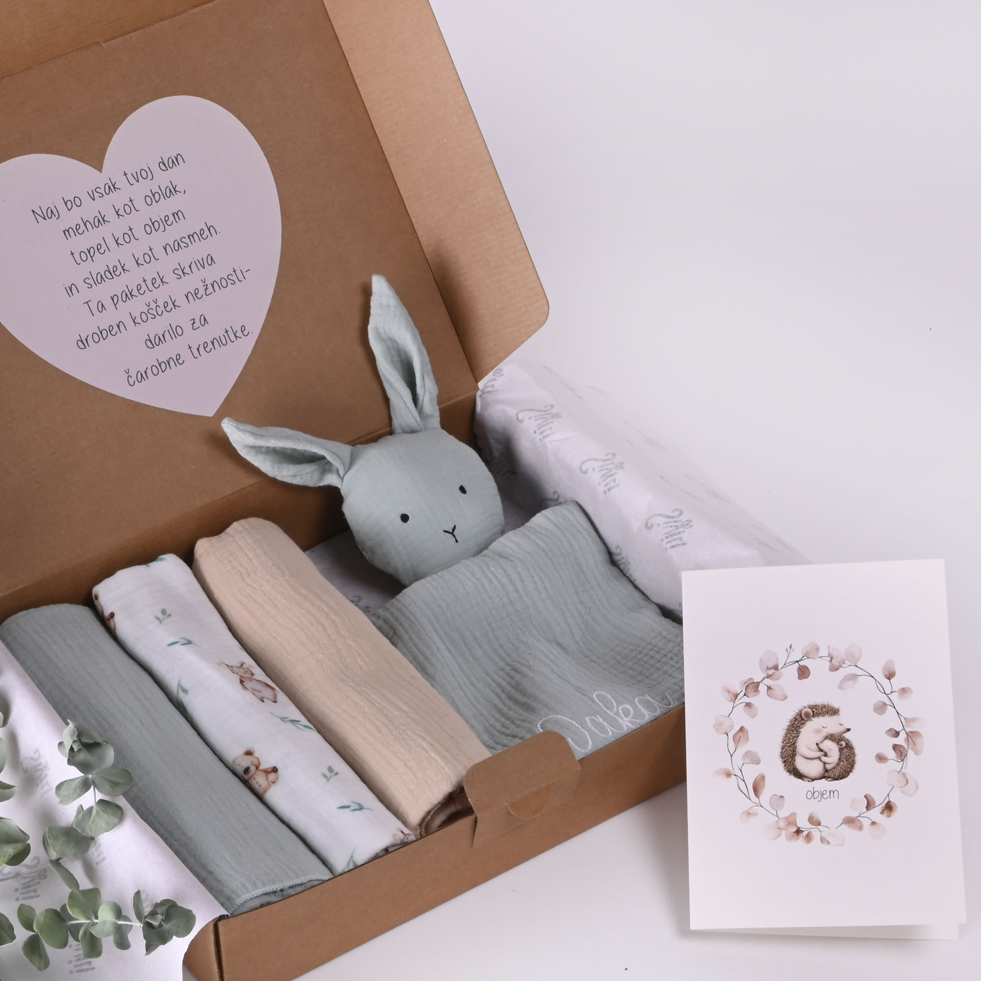 - lično kartonsko darilno embalažo s tiskom srčka in slovenskim tekstom