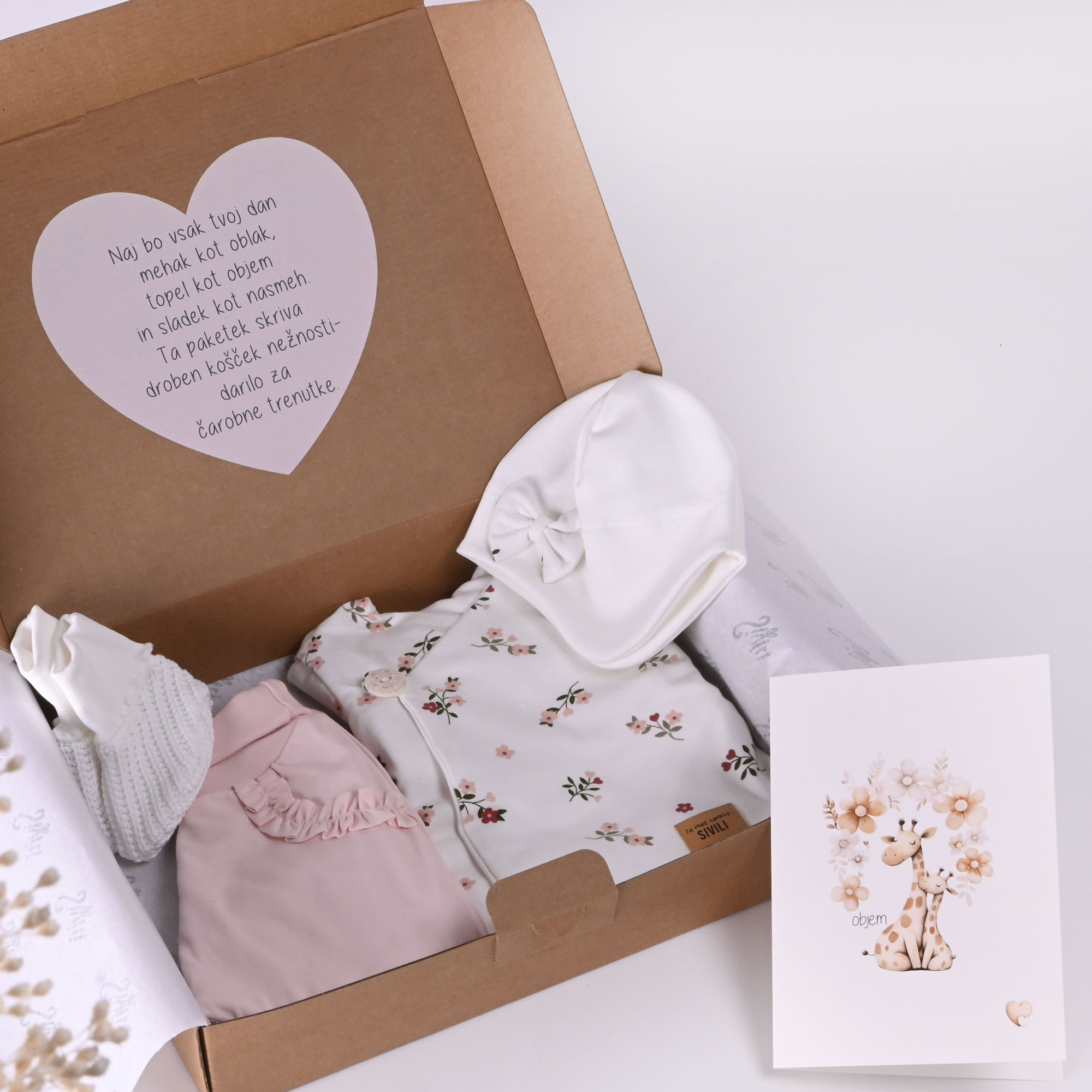 Tkanina je potiskana z nežnim motivom rožic, ki simbolizirajo otroško igrivost in nagajivost. Komplet prejmete v lični darilni embalaži, ki že na prvi pogled ustvari poseben občutek. Na notranji strani pokrova je natisnjen srček s slovenskim tekstom, kar doda osebno noto.
