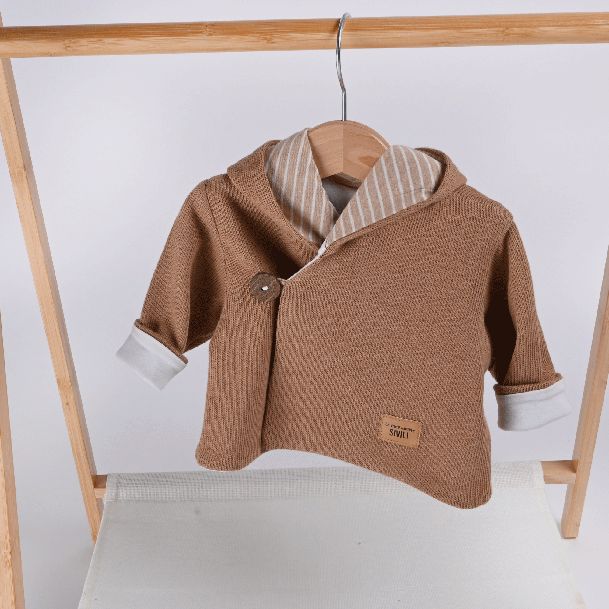 Naša jopica za dojenčke je popolna izbira za starše, ki cenijo udobje in naravne materiale. Za izdelavo smo uporabili tkanini iz 100 % biodinamičnega bombaža v lešnik naravni barvi, kar pomeni, da je jopica brez barvil zato je idealna za občutljivo otroško kožo.