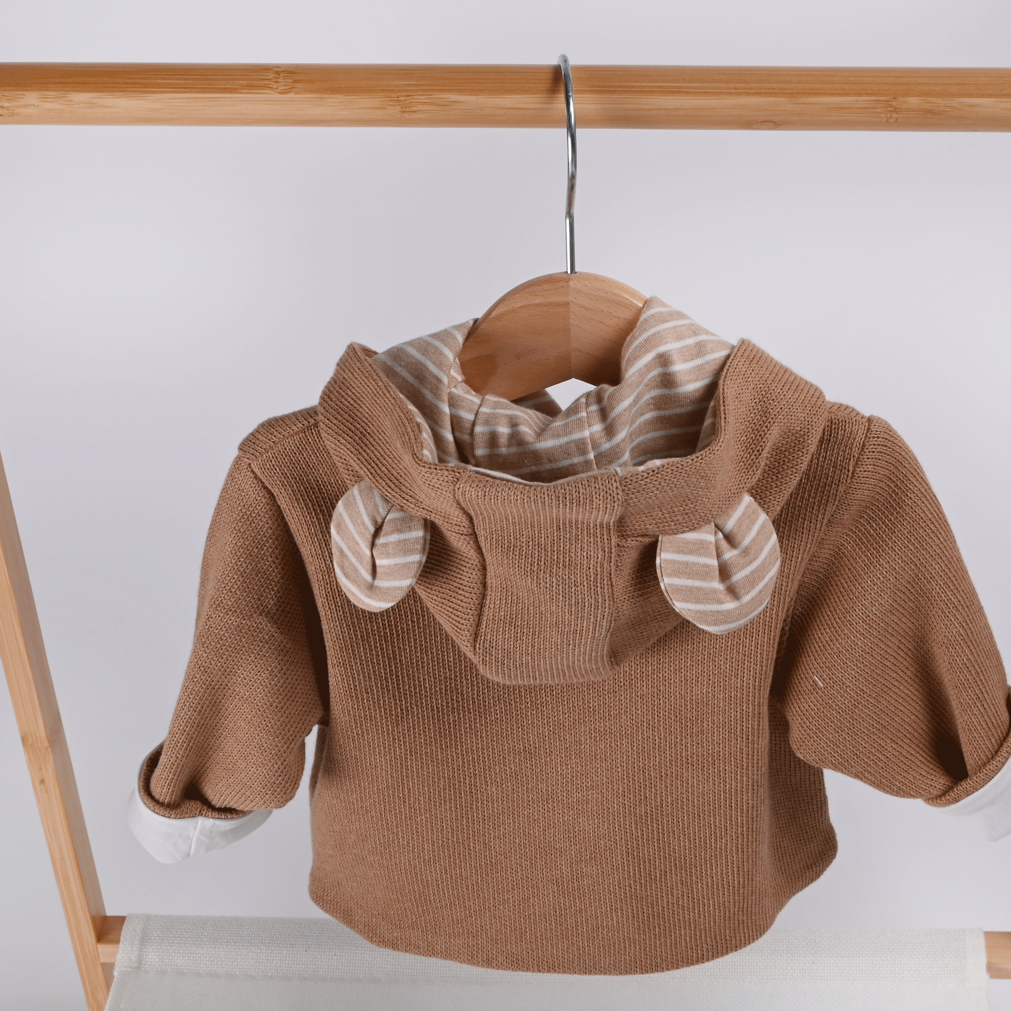 Jopica je podložena z mehko naravno bombažno tkanino, ki poskrbi za udobje in prijeten občutek. Leseni gumbki dodajo čudovit naraven videz in so hkrati prijazni do okolja. Piko na i pa izgledu dodajo tudi ušeska na kapuci!