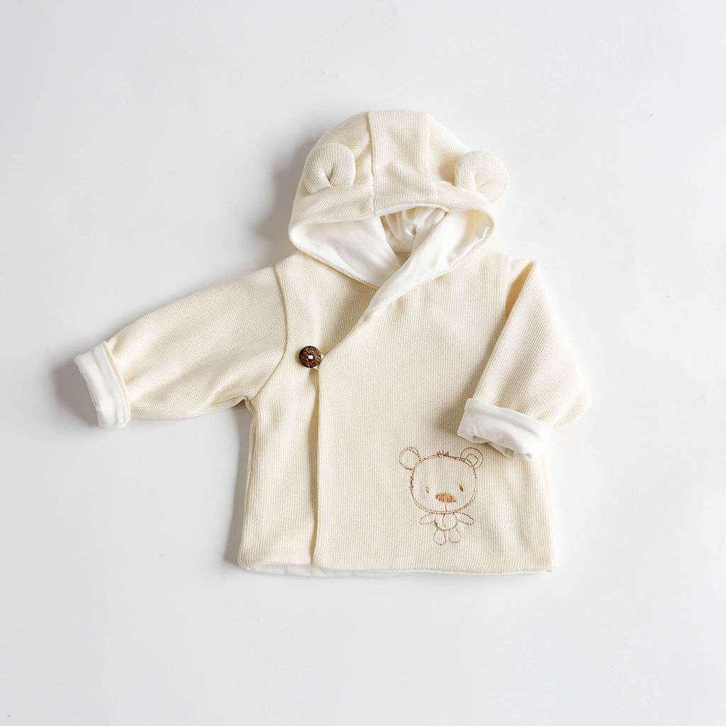 Jopica je podložena z mehko naravno bombažno tkanino, ki poskrbi za udobje in prijeten občutek. Leseni gumbki dodajo čudovit naraven videz in so hkrati prijazni do okolja. Piko na i pa izgledu dodajo tudi ušeska na kapuci!