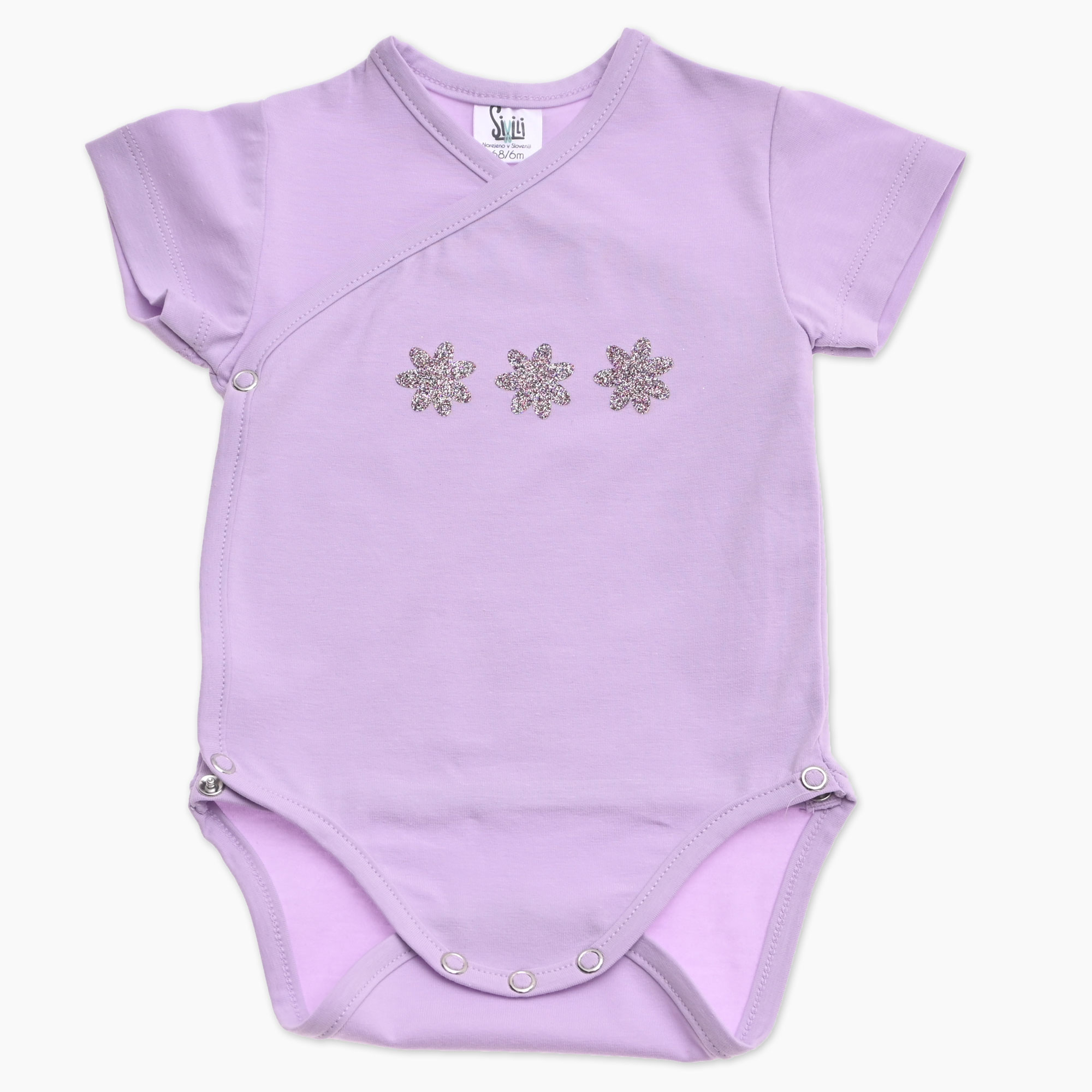 Otroški bodi na preklop v lila barvi s tremi svetlečimi rožicami. Slovenski izdelek.