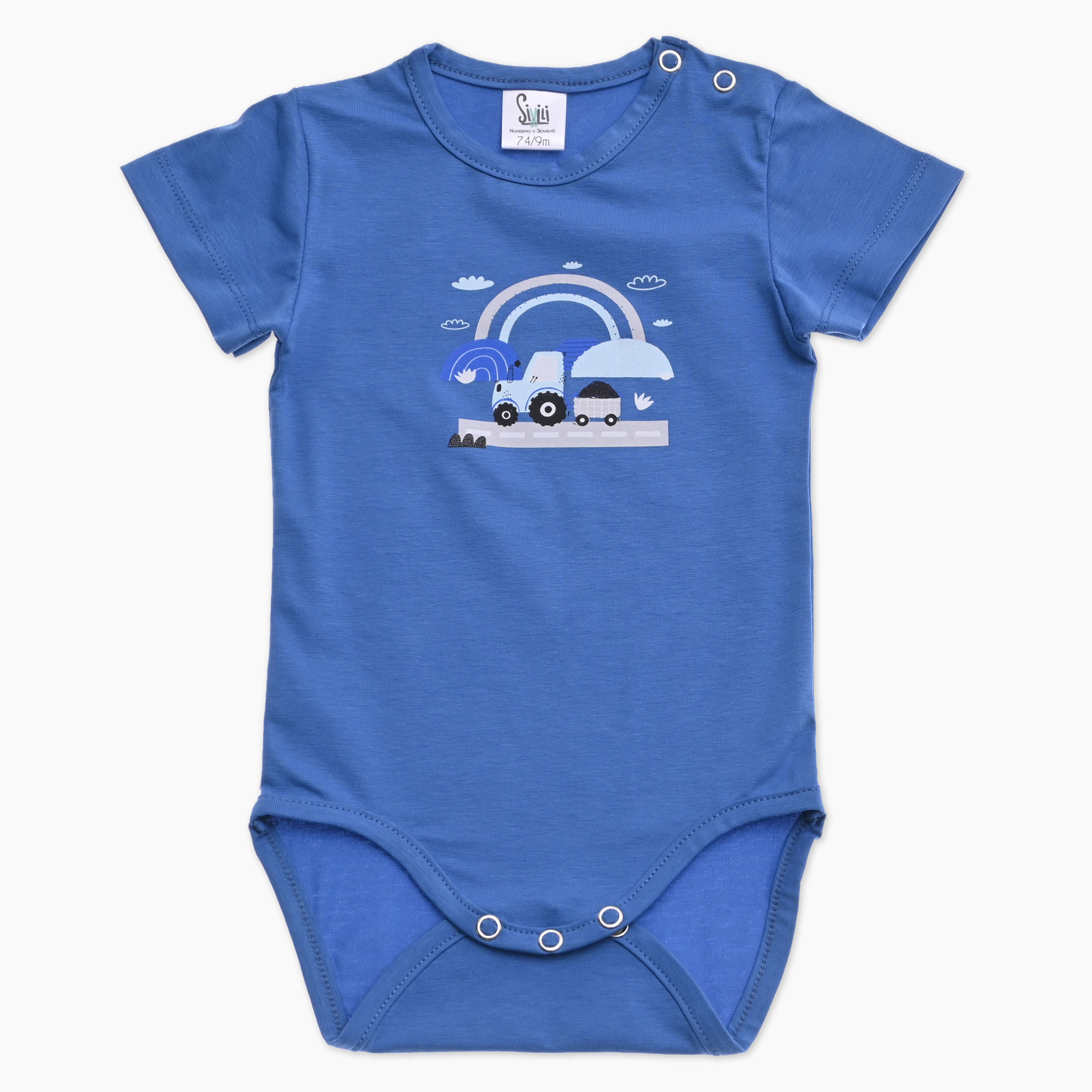Otroški bodi za fanta v modri barvi s tiskom traktorja pod mavrico. Narejeno v Sloveniji