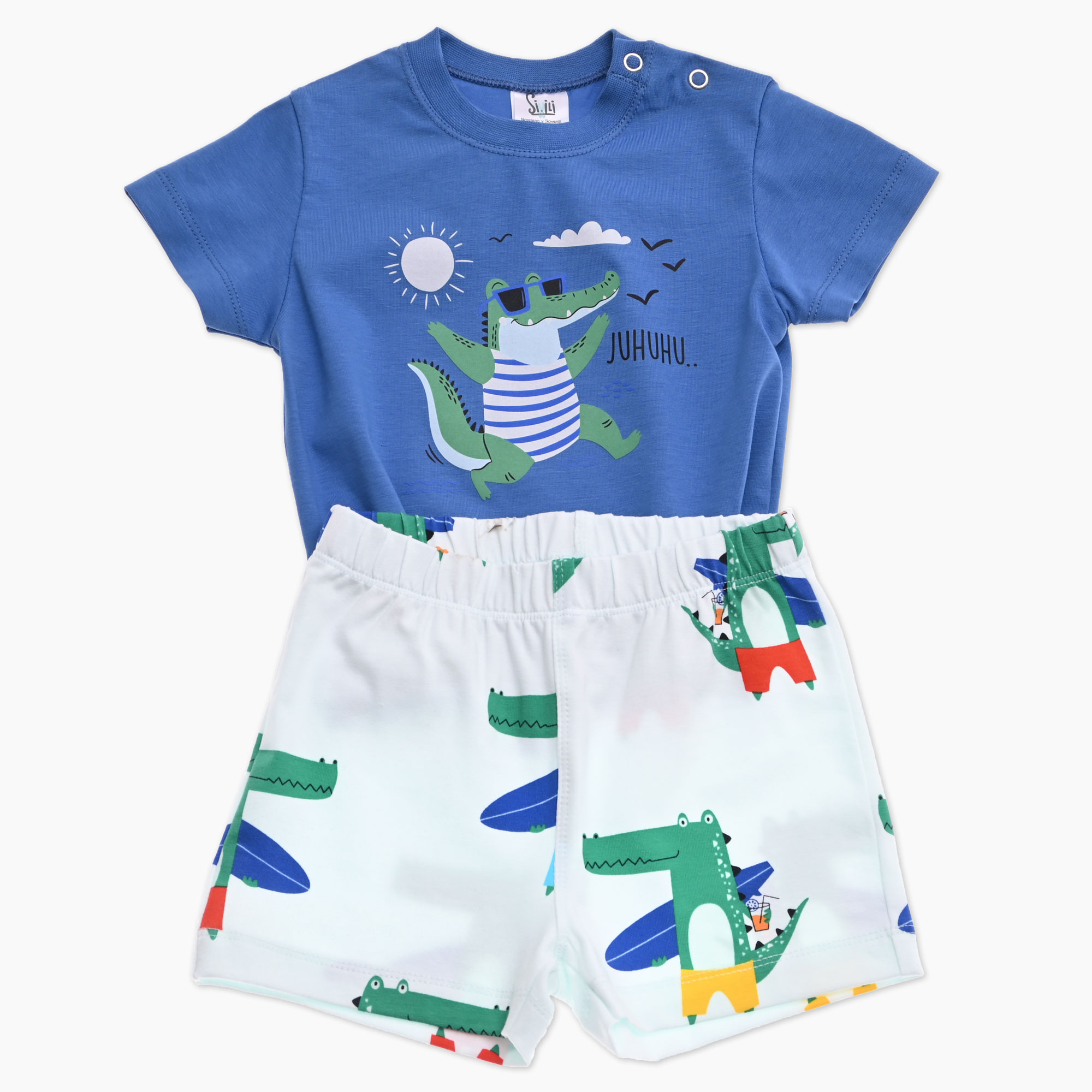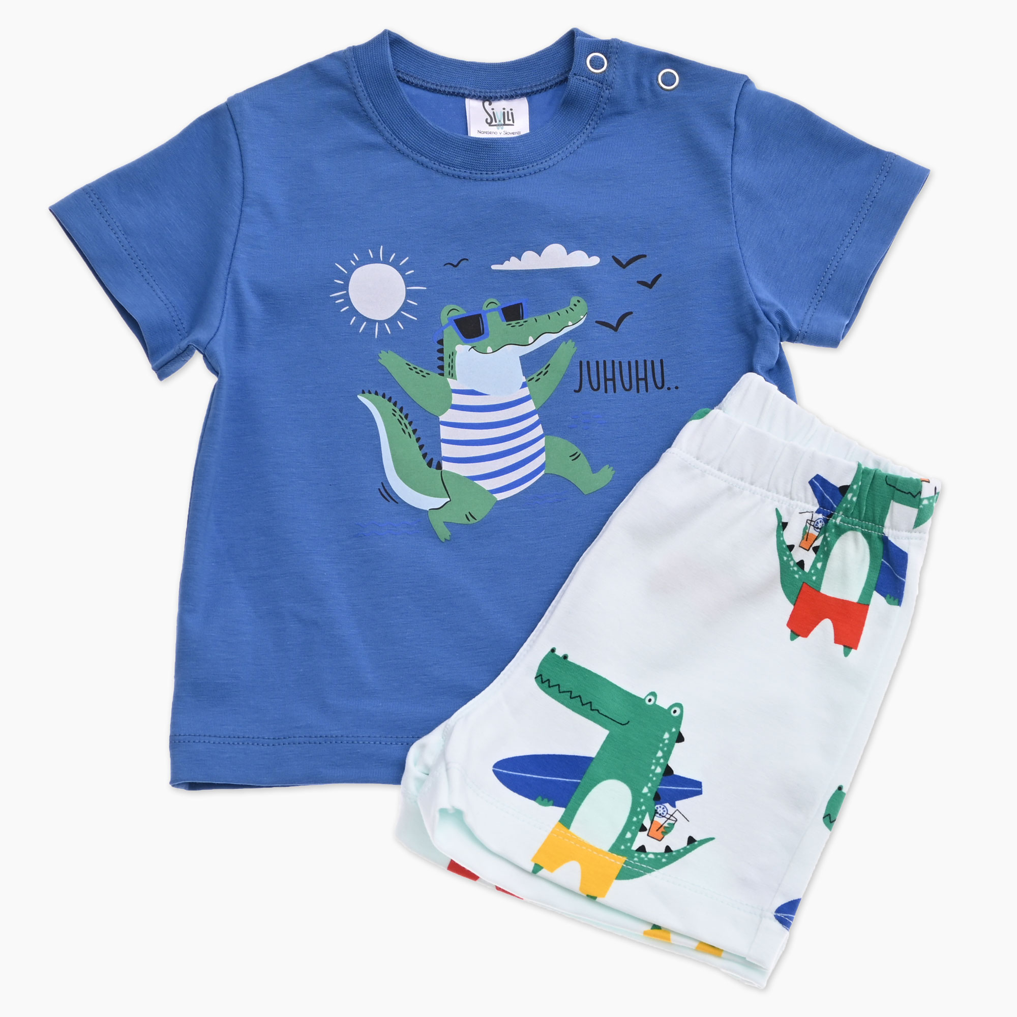 Otroški komplet za dojenčka s kratkimi hlačami, ki jih krasi tisk krokodilov in modro majico s tiskom krokodila, ki se zabava. Izdelano v Slovenij