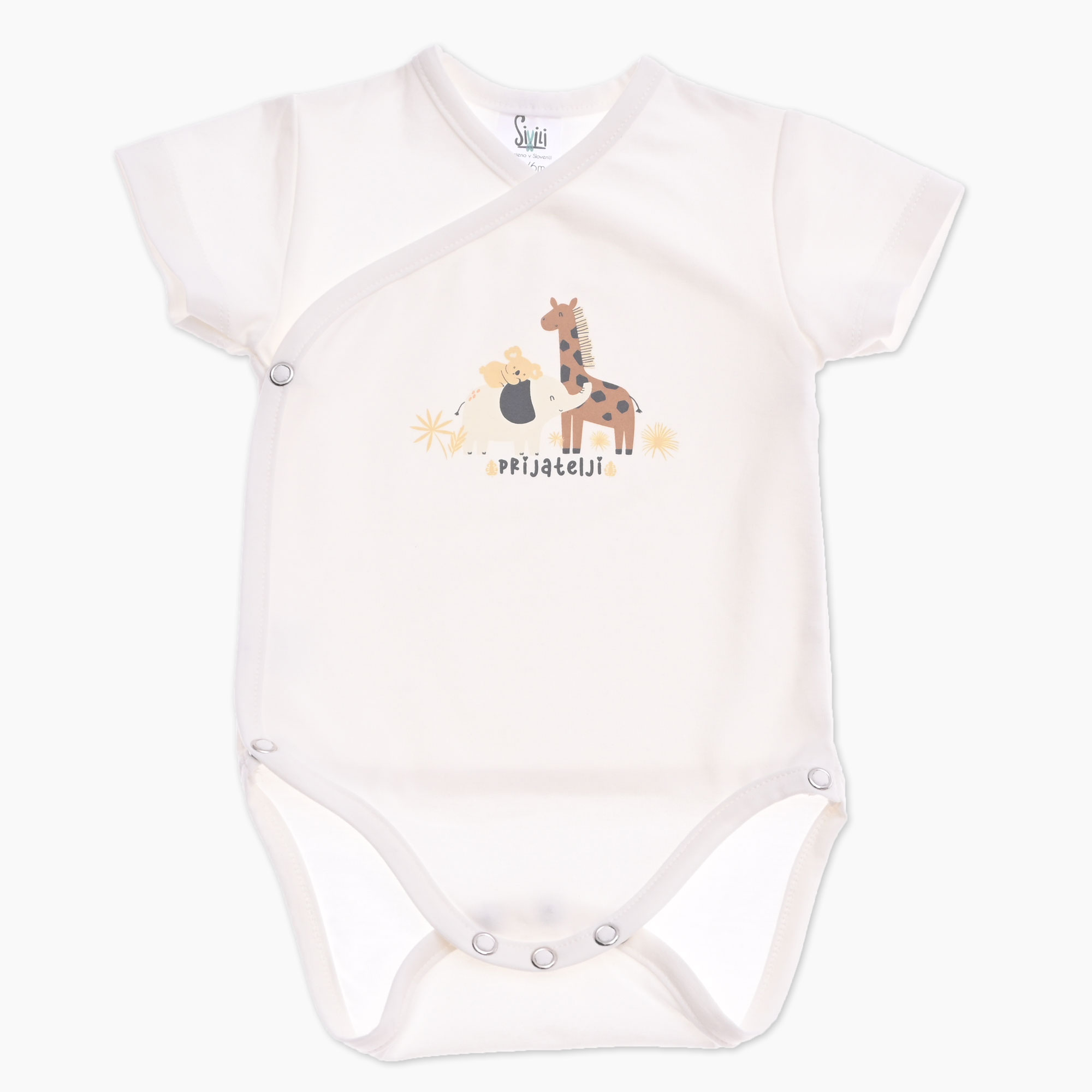 Otroški bodi na preklop v smetana barvi s slončkom in žirafo – PRIJATELJI. Slovenski izdelek.