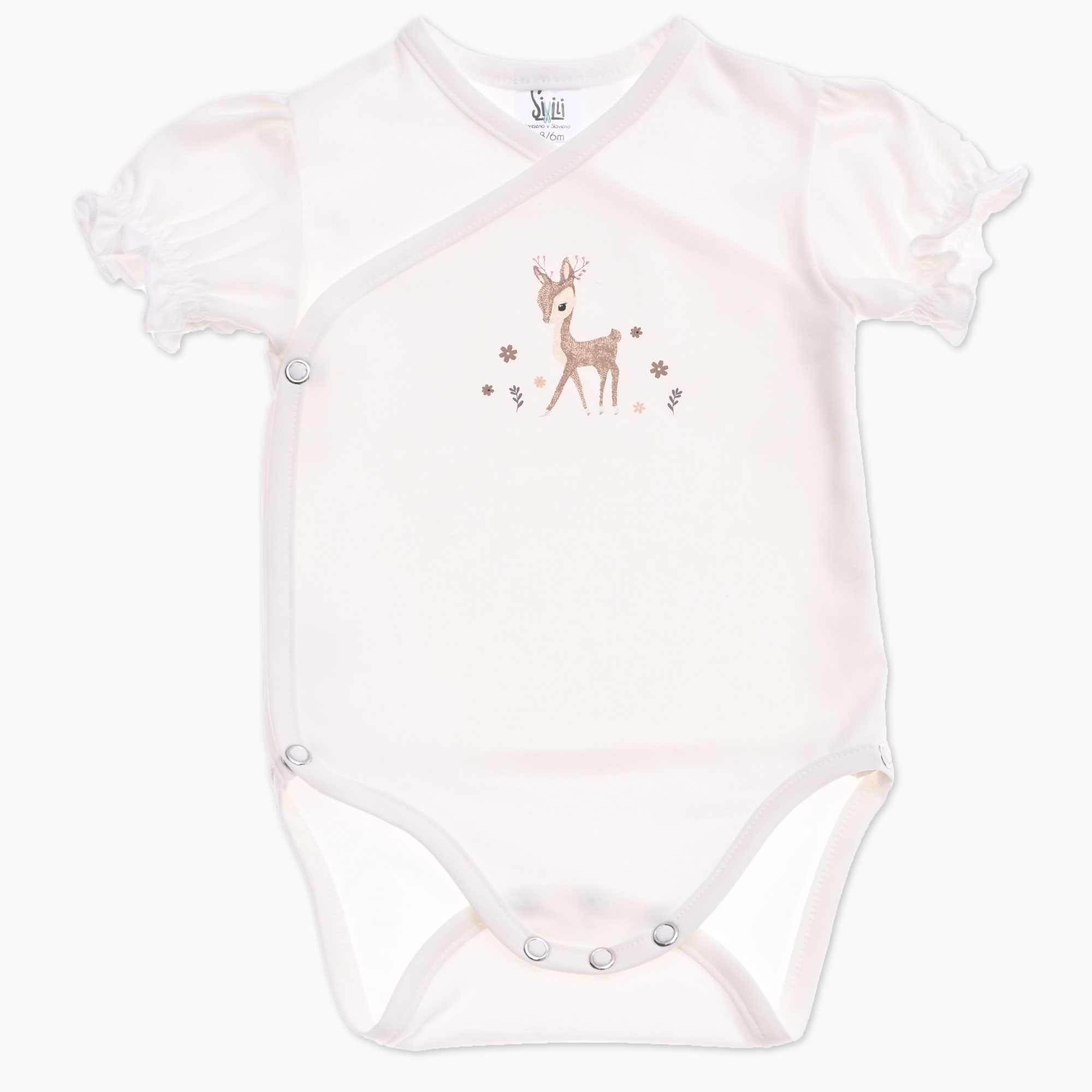 Otroški bodi na preklop v smetana barvi s srnico med rožicami. Slovenski izdelek.