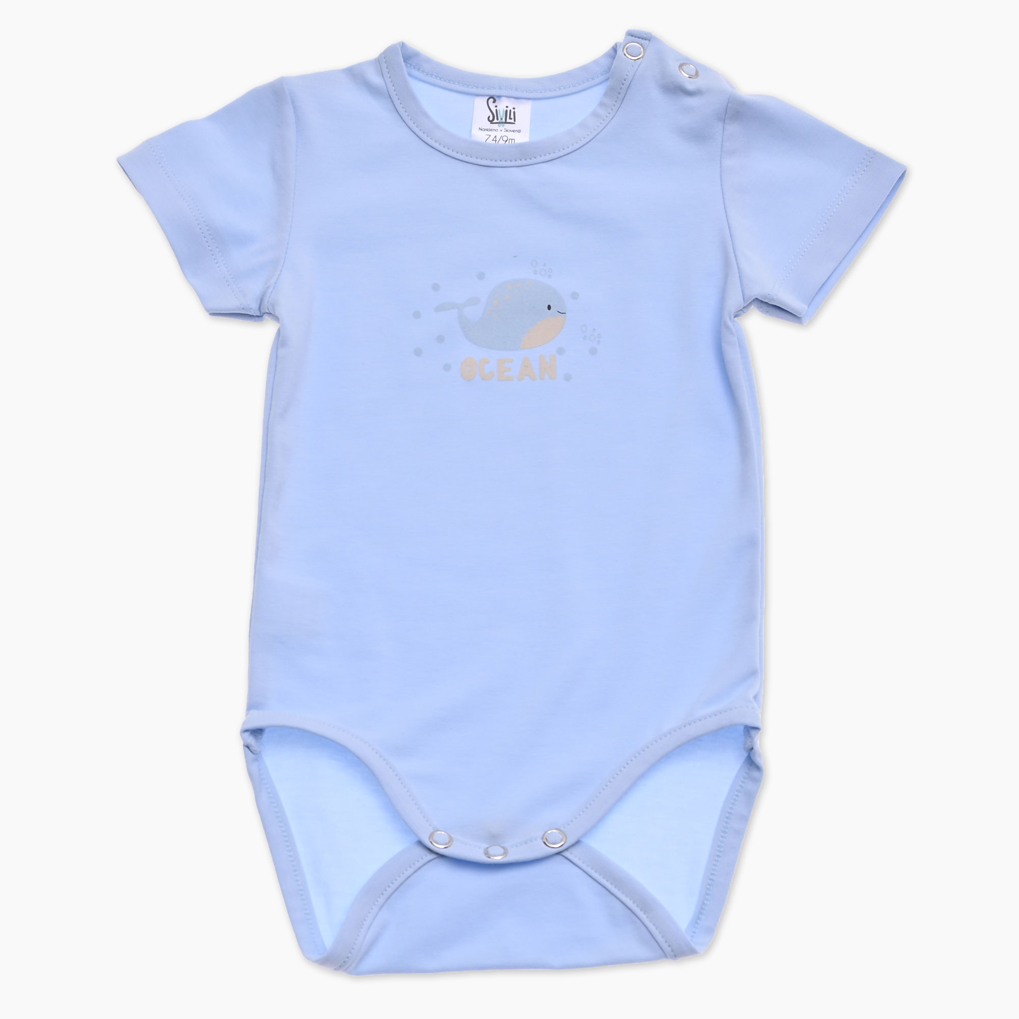 Otroški bodi za v svetlo modri barvi s tiskom kita in napisom – OCEAN. Narejeno v Sloveniji
