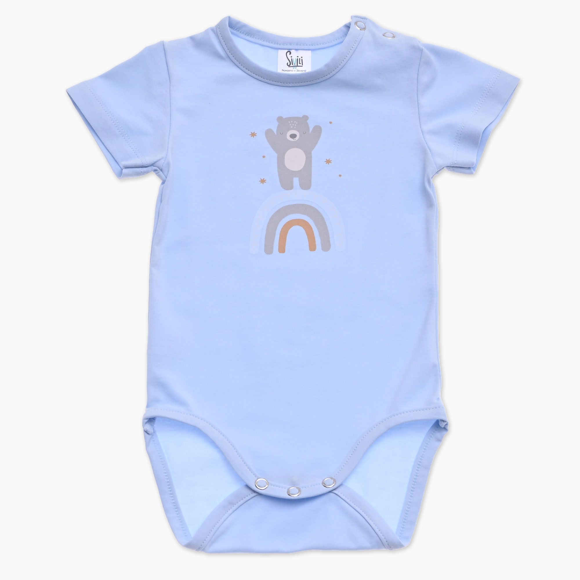Otroški bodi za v svetlo modri barvi s tiskom medvedka na mavrici. Narejeno v Sloveniji