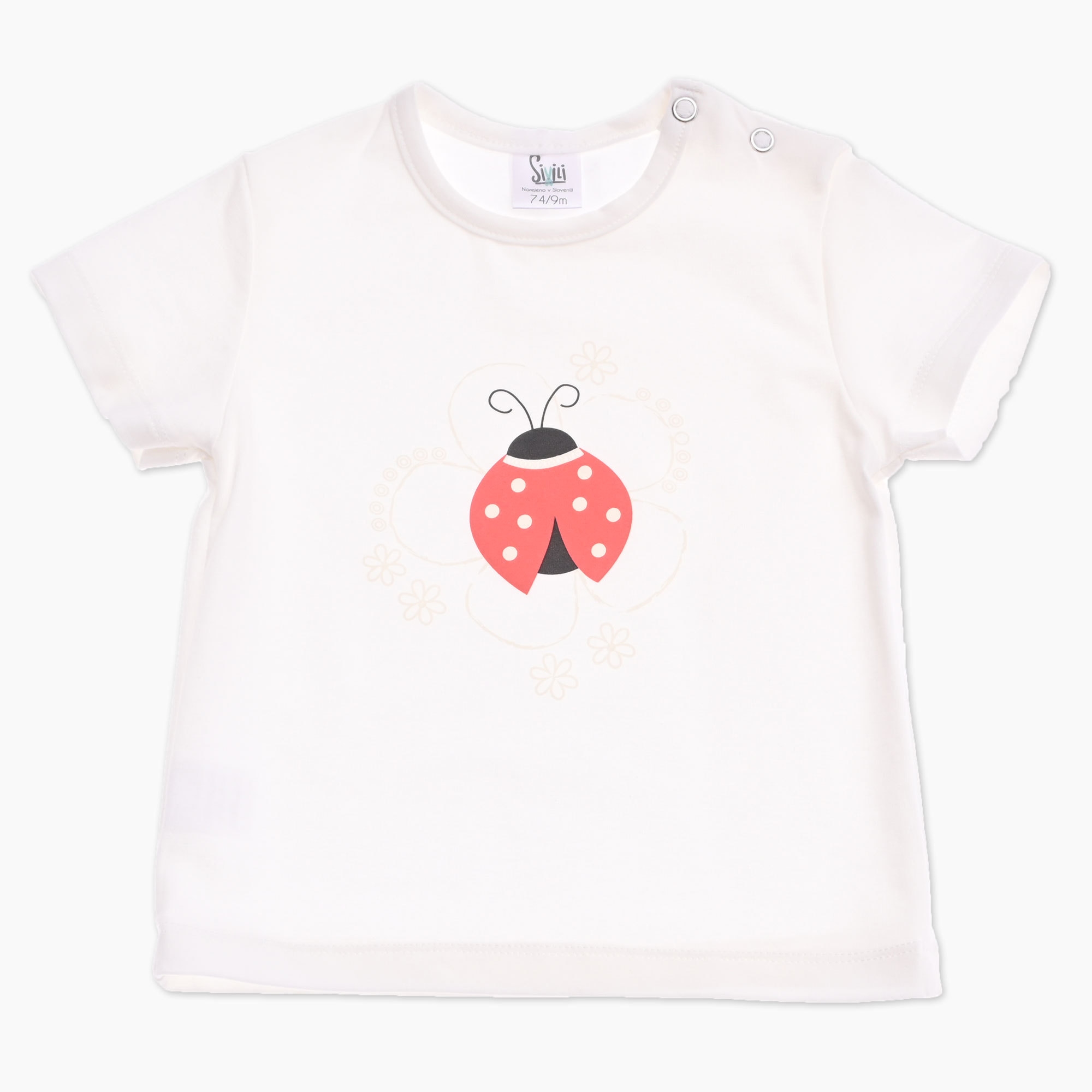Otroška majica za punčko s kratkimi rokavi v smetana barvi s tiskom pikapolonice. Izdelana v Sloveniji!