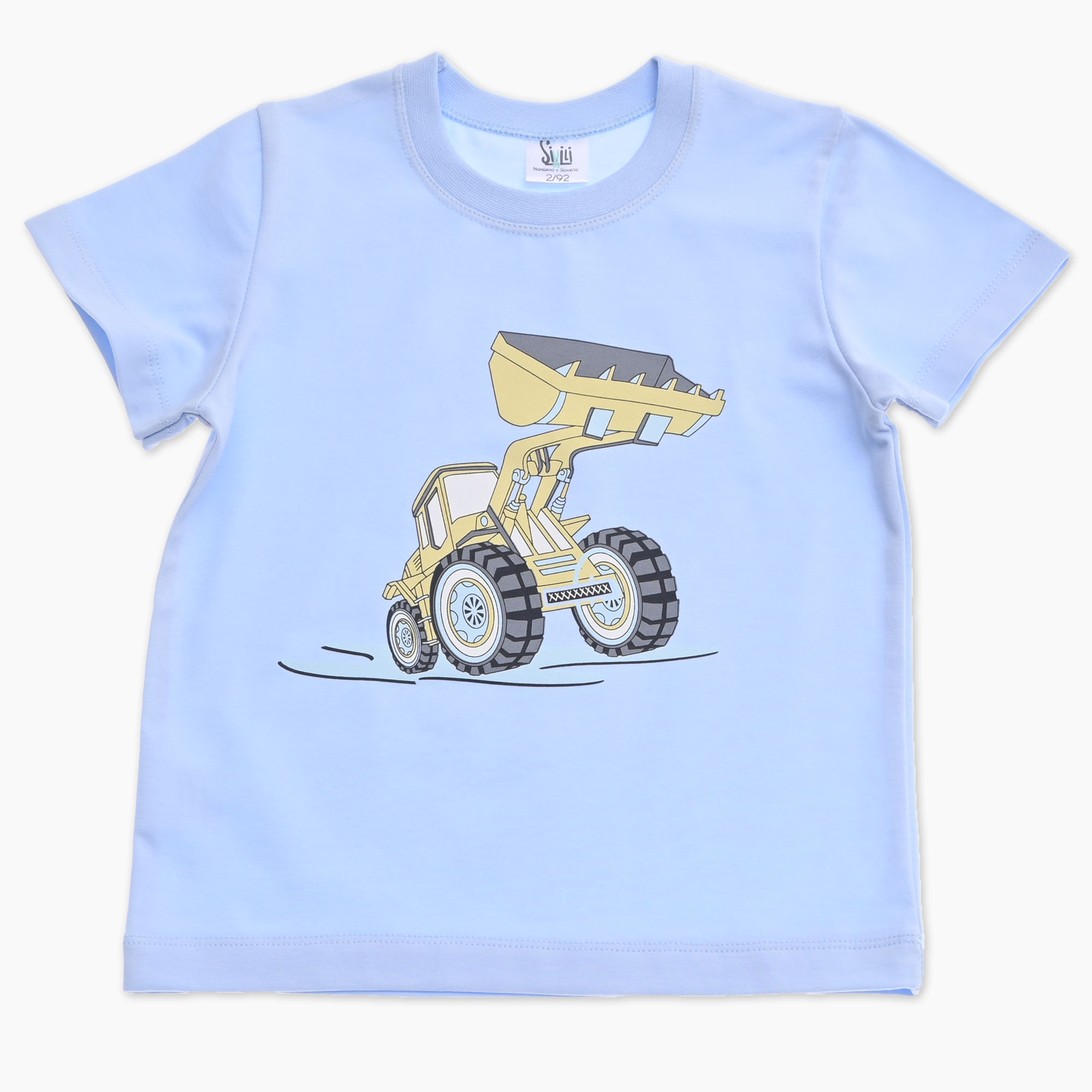 Otroška majica za fanta s kratkimi rokavi v svetlo modri barvi s tiskom bagra za nalaganje. Izdelana v Sloveniji!