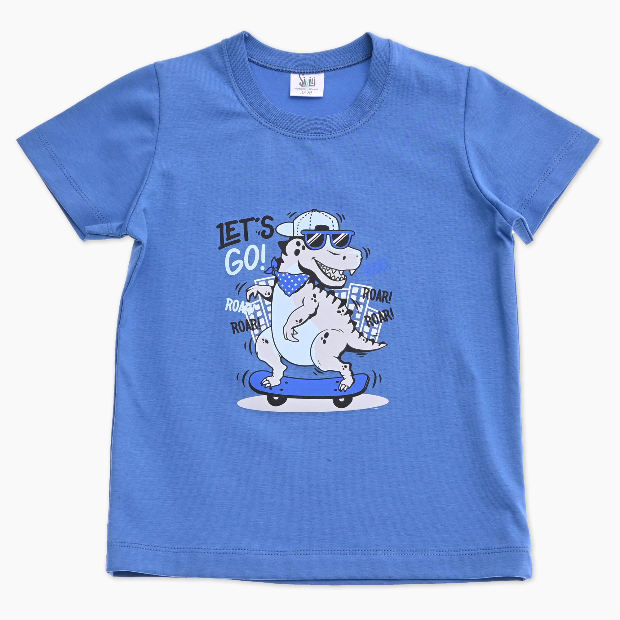 Otroška majica za fanta s kratkimi rokavi v modri barvi s tiskom dinozavra na rolki. Izdelna v Sloveniji!