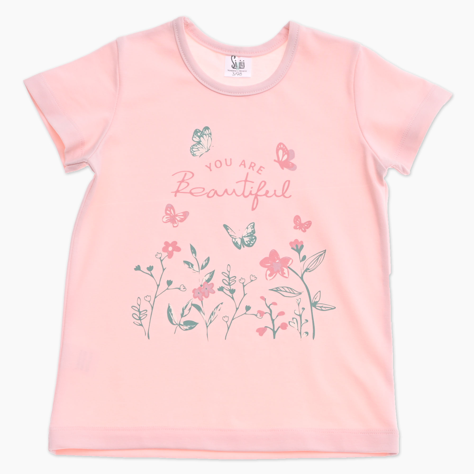 Otroška majica za punčko s kratkimi rokavi v roza barvi z rožicami, metuljčki in napisom. Izdelano v Sloveniji!