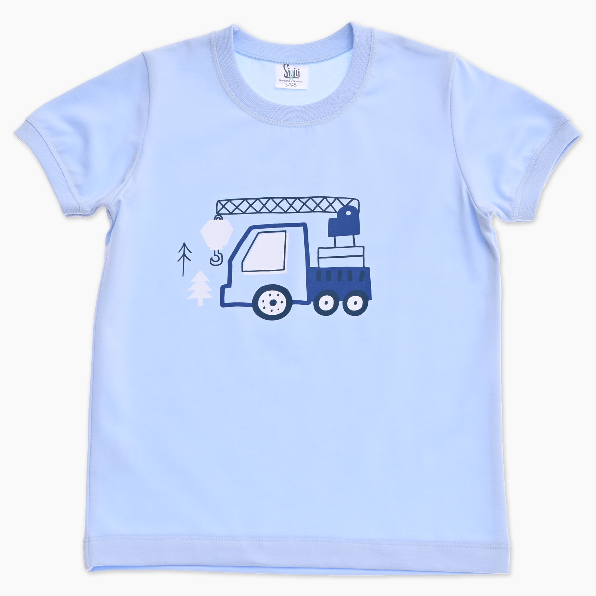 Otroška majica za fanta s kratkimi rokavi v svetlo modri barvi s tiskom avtodvigala. Izdelna v Sloveniji!