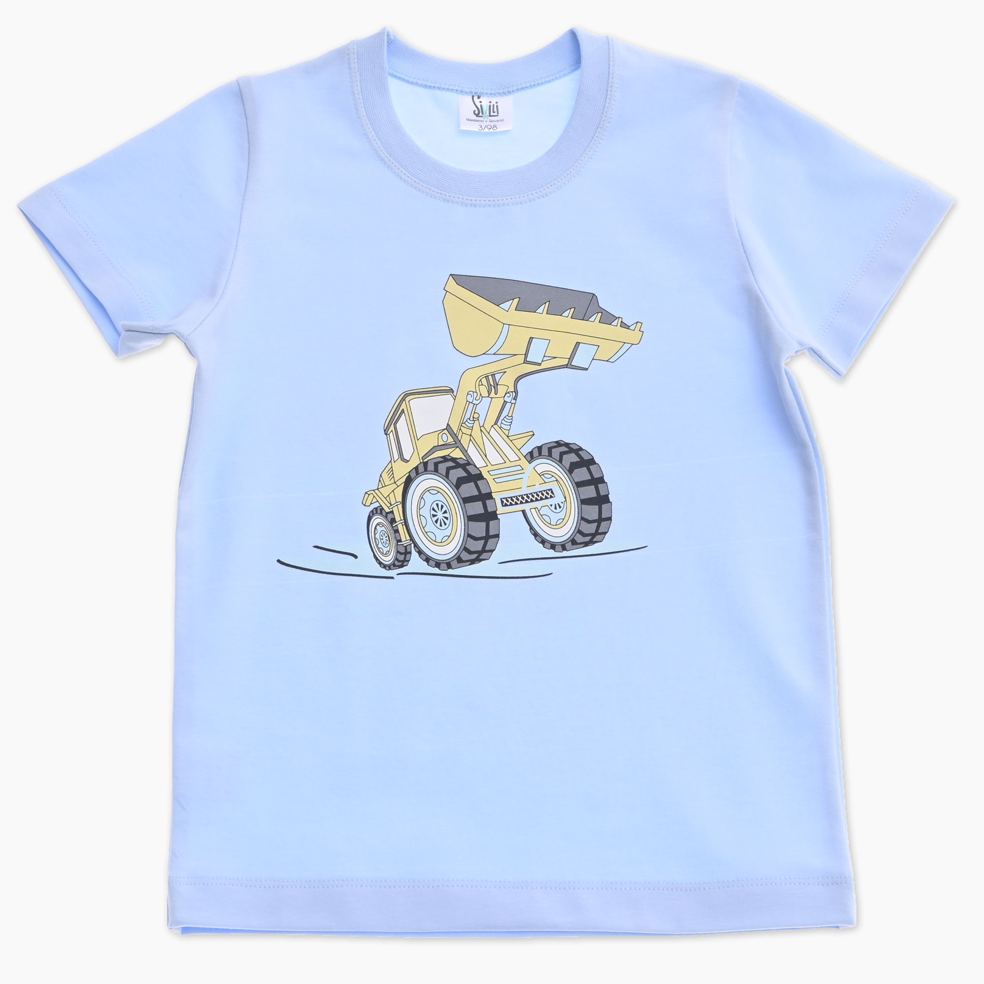 Otroška majica za fanta s kratkimi rokavi v svetlo modri barvi s tiskom nakladača. Izdelna v Sloveniji!