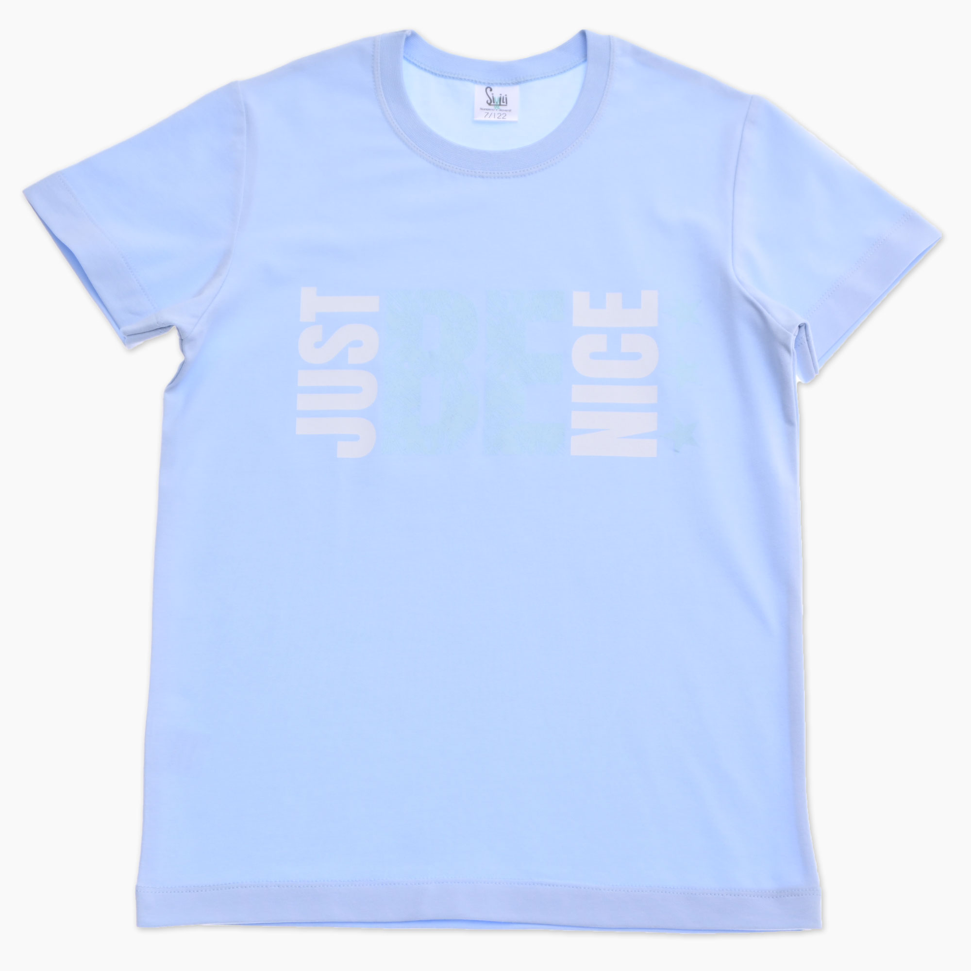 Otroška majica za fanta s kratkimi rokavi v svetlo modri barvi z napisom JUST BE NICE. Izdelna v Sloveniji!