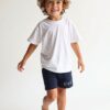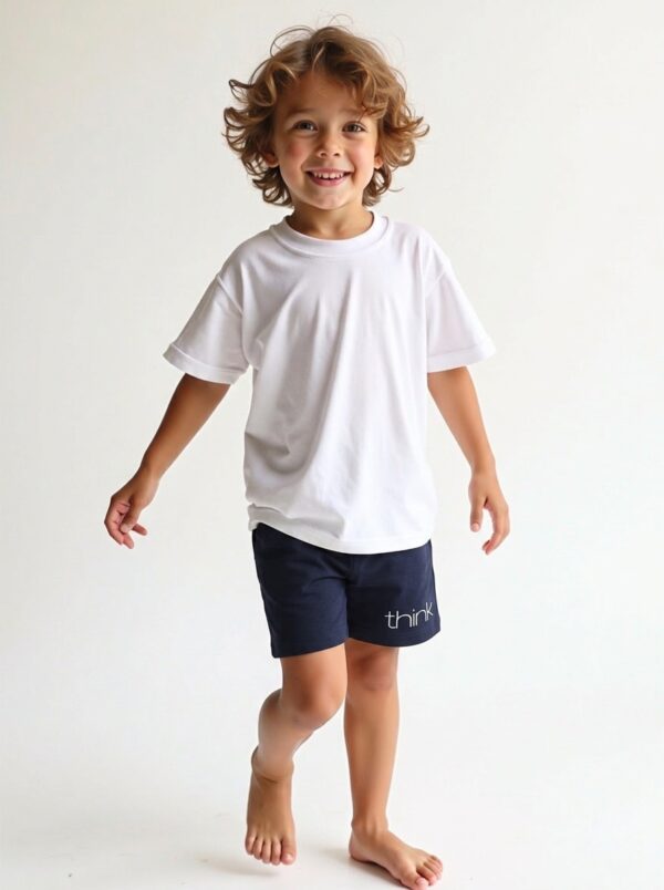 Čudovite mehke otroške kratke hlače za fanta v temno modri barvi so odlična izbira za aktivne poletne dni. Dopolnjuje jih moderen napis THINK BIG, ki hlačam daje športen in igriv videz.