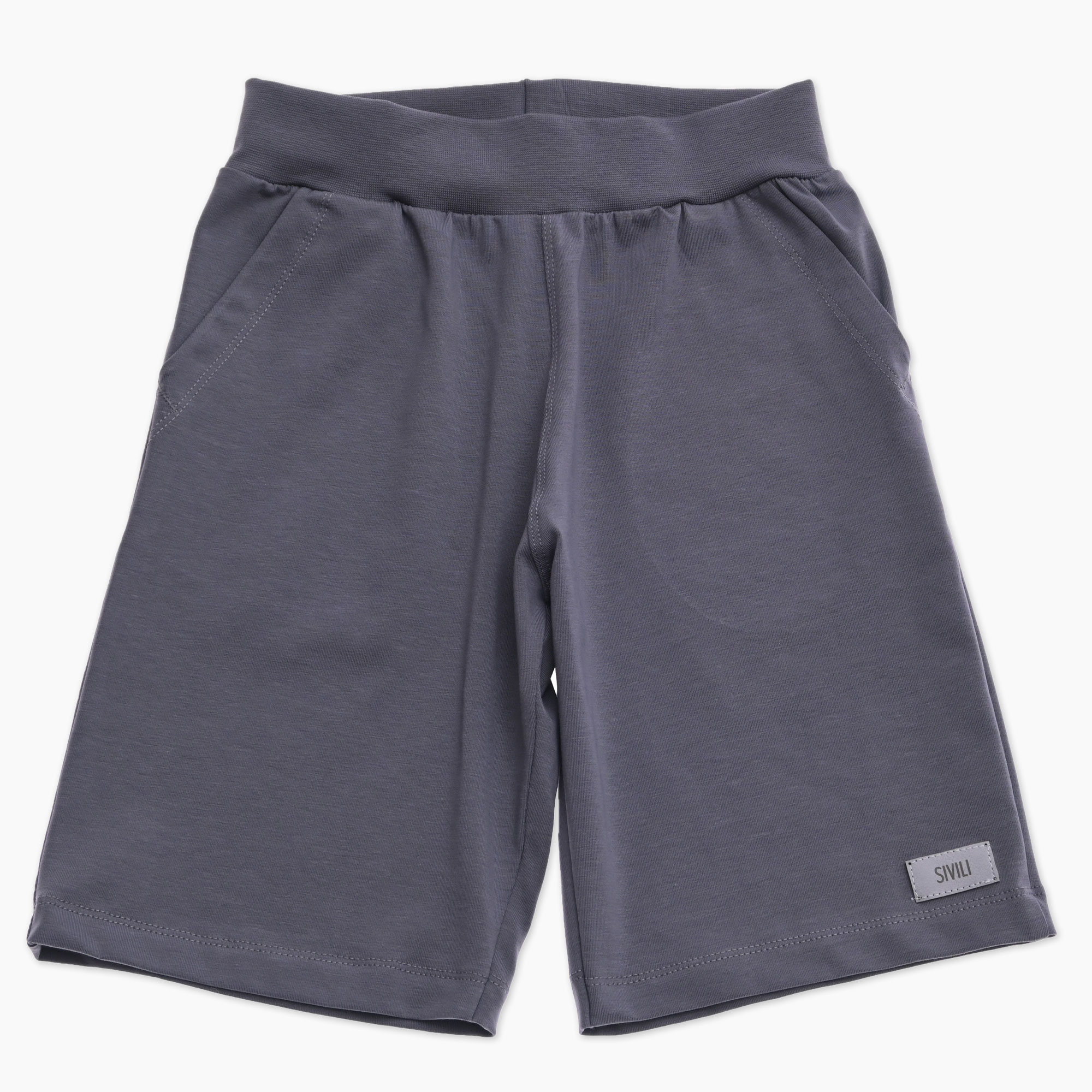 Otroške kratke hlače za fanta v sivi barvi z našitkom in napisom SIVILI. Slovenski izdelek!