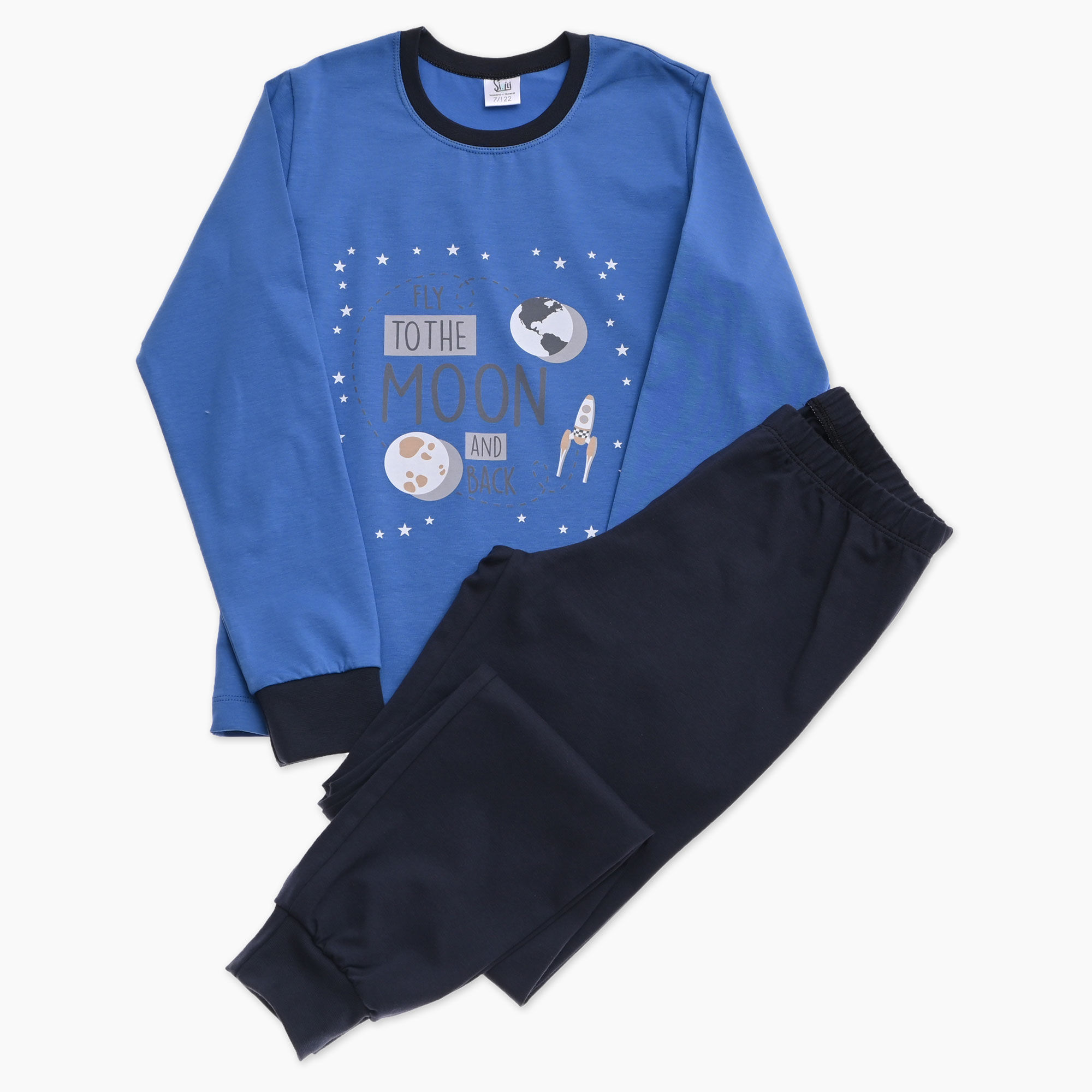 Udobna otroška pižama za fanta z motivom rakete in planetov. Izdelana iz mehkega organskega bombaža v modri in temno sivi barvi z dodatkom elastana za popoln spanec.