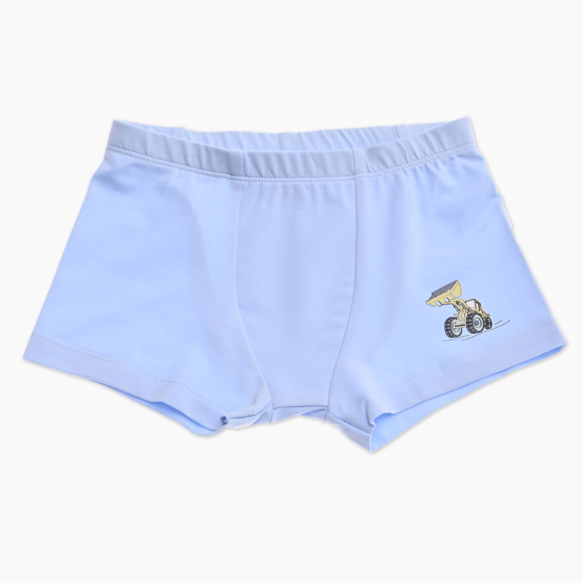 Udobne otroške bokserice za fanta z motivom bagra v svetlo modri barvi. Mehke, raztegljive in prijeten za nošenje iz organskega bombaža, narejene v Sloveniji.