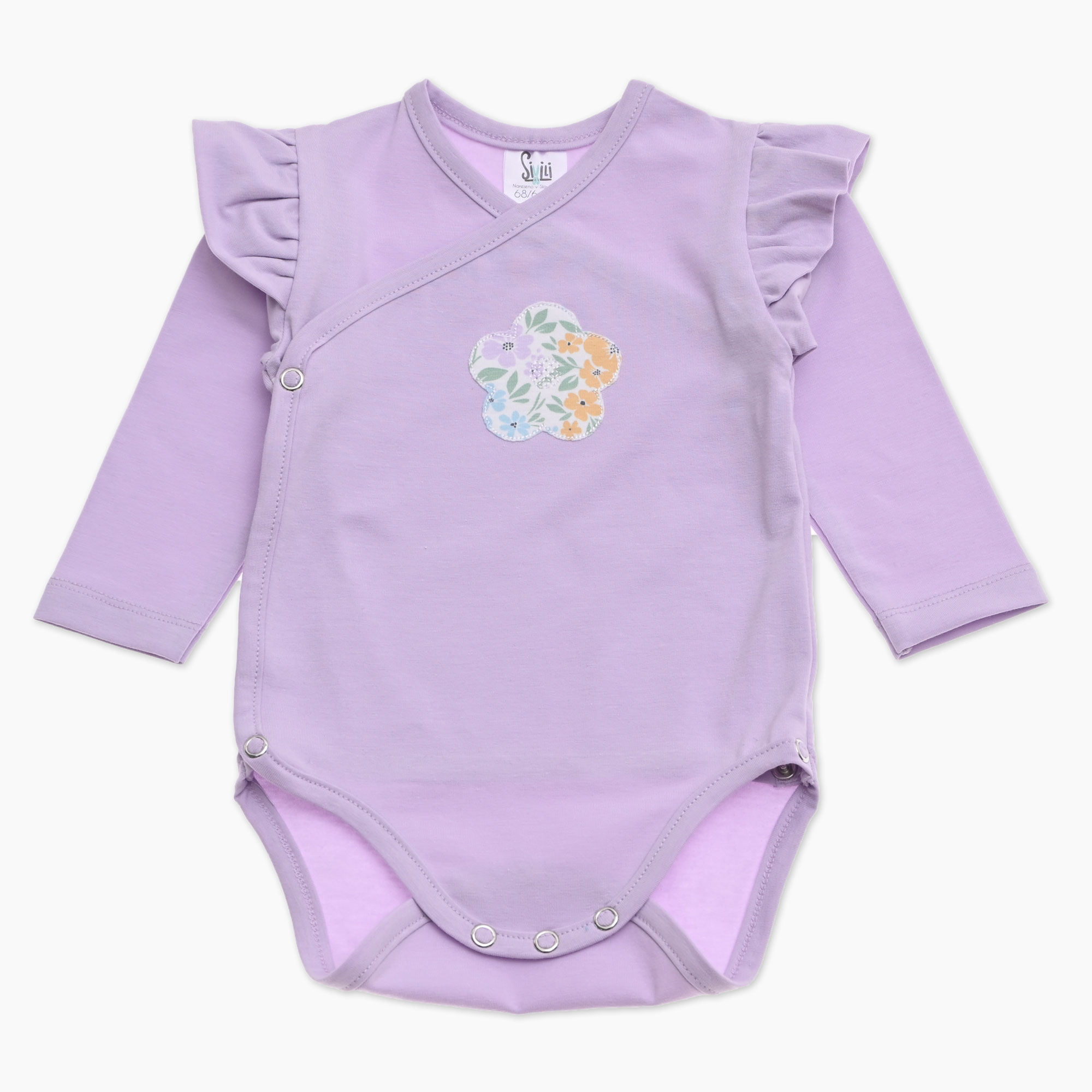 Otroški bodi na preklop za punčko v lila barvi z volančki in vezenim cvetom