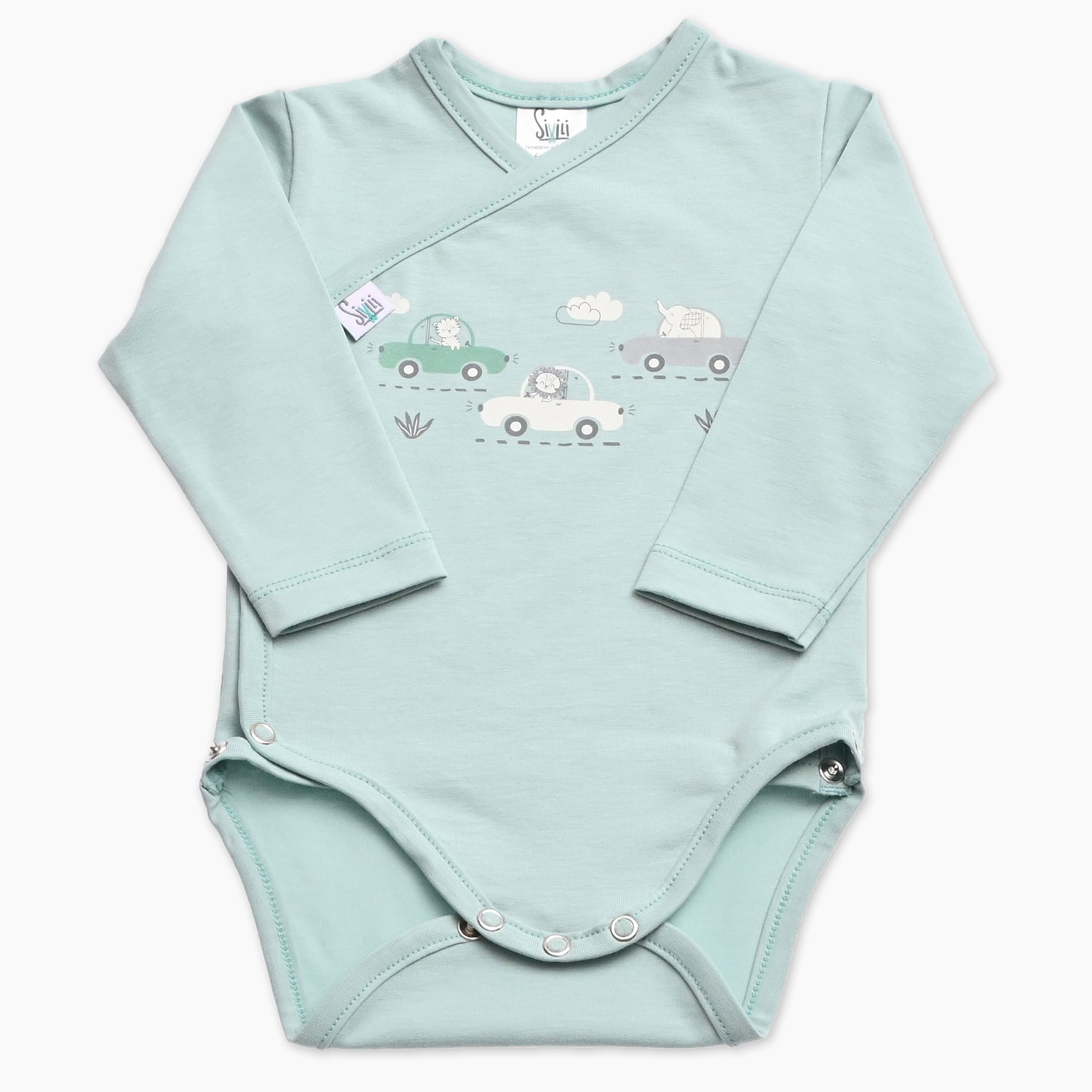 Otroški bodi na preklop v mint barvi s tiskom avtomobilov