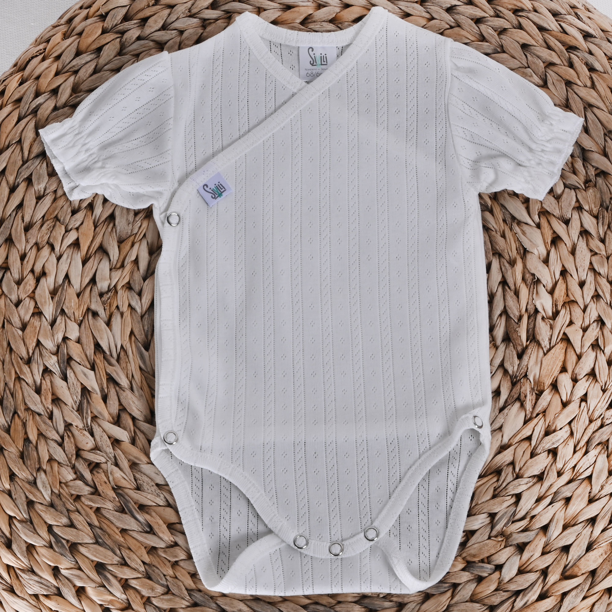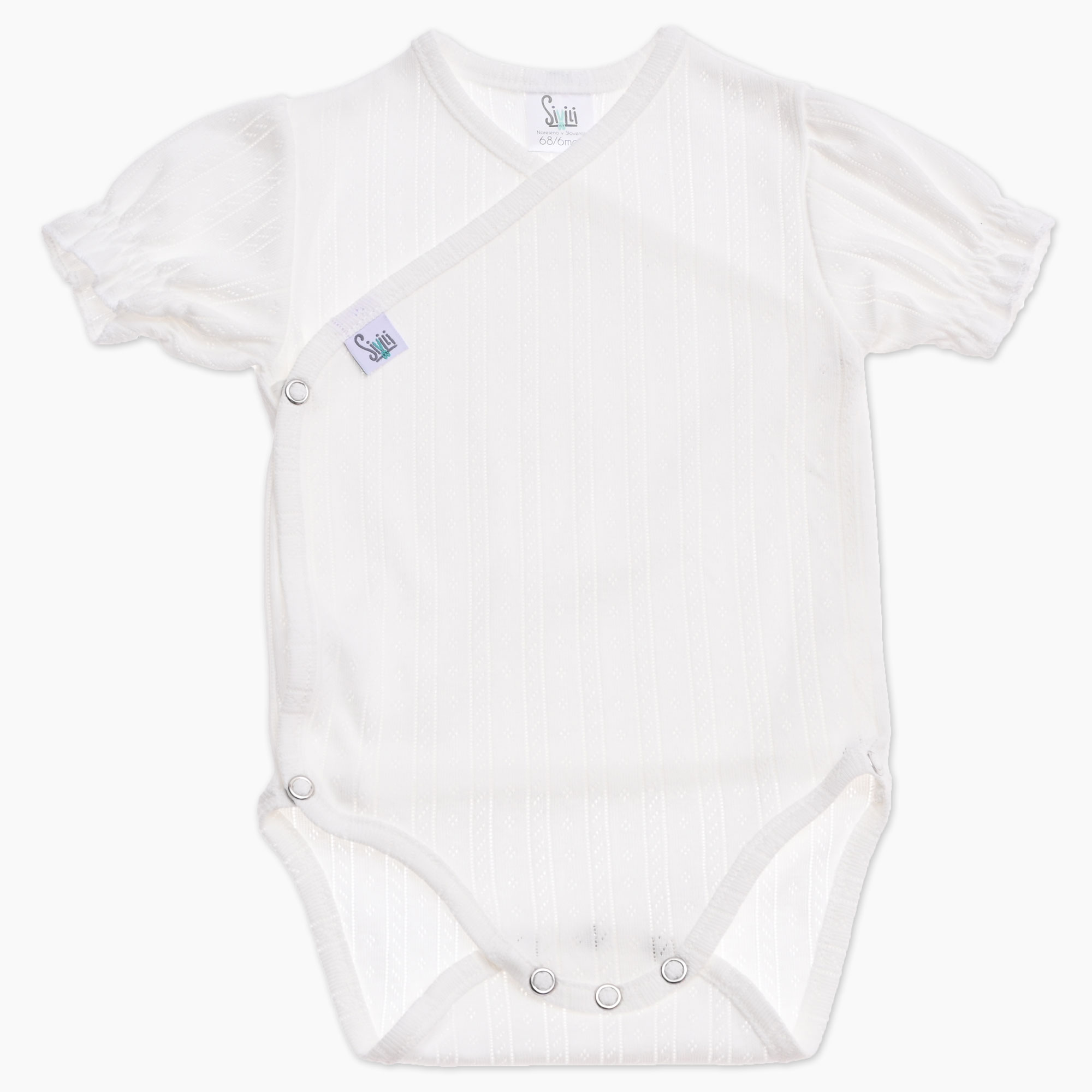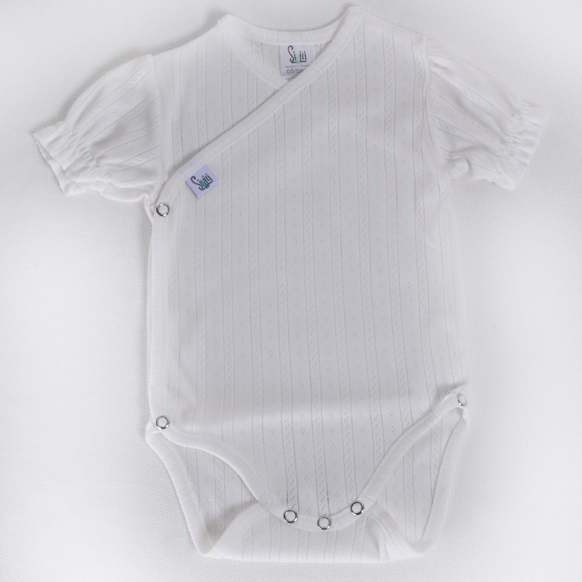 Smetana otroški bodi na preklop je zasnovan za nežne in udobne prve dni dojenčka. Mehka smetana barva, subtilen vzorček v tkanini ter nabrani kratki rokavi ustvarjajo nežen, eleganten in brezčasen videz, primeren tako za vsakodnevno nošenje kot za posebne priložnosti.