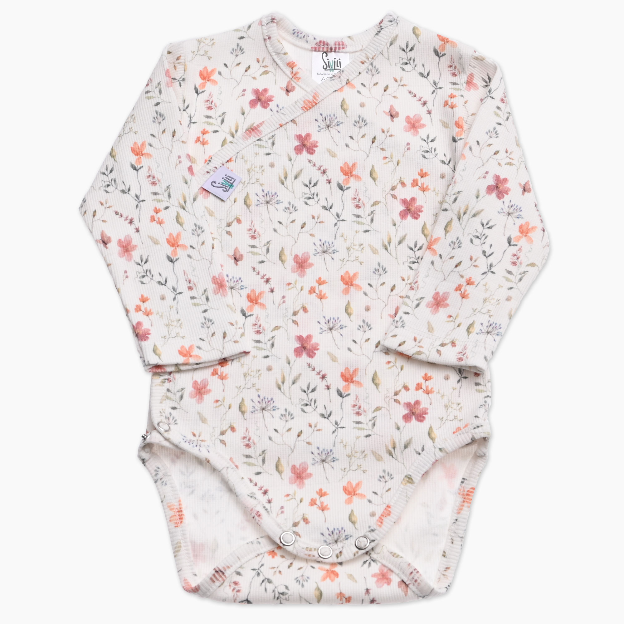 Bodi je izdelan iz rebrastega materiala s sestavo 94 % bombaž in 6 % elastan, kar zagotavlja prijetno raztegljivost, mehkobo in prijaznost do občutljive kože. Okrašen je s tiskom cvetlic, ki doda igriv in eleganten detajl, primeren za punčke. Netki so brez niklja, zato ne dražijo kože.