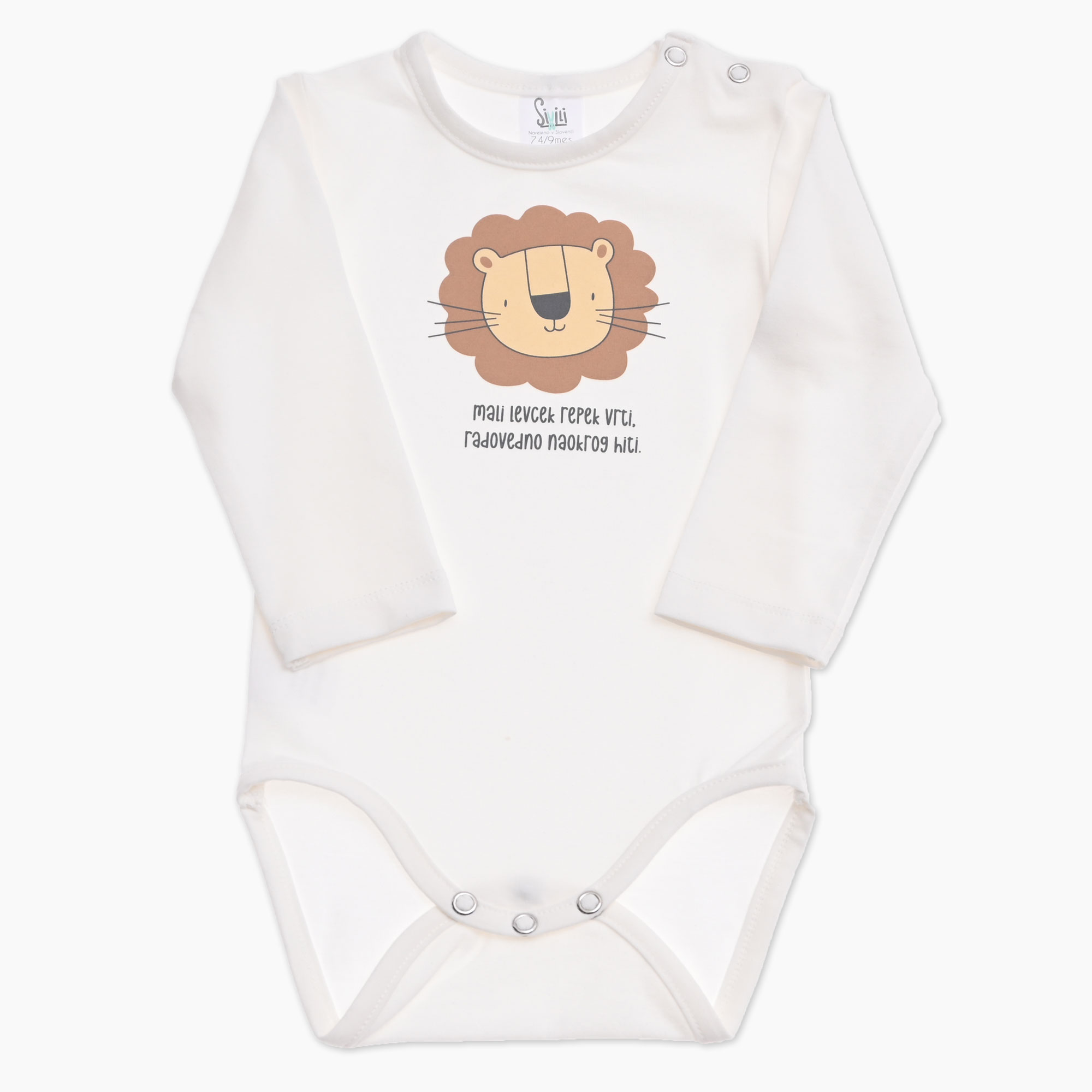 Otroški bodi v smetana barvi s tiskom levčka je igriv in prisrčen kos, ki združuje udobje in domiselno sporočilo. Motiv levčka dopolnjuje slovenski verz »MALI LEVČEK REPEK VRTI, RADOVEDNO NAOKROG HITI.«, ki prinaša toplino in radovednost v vsakodnevne trenutke vašega dojenčka.