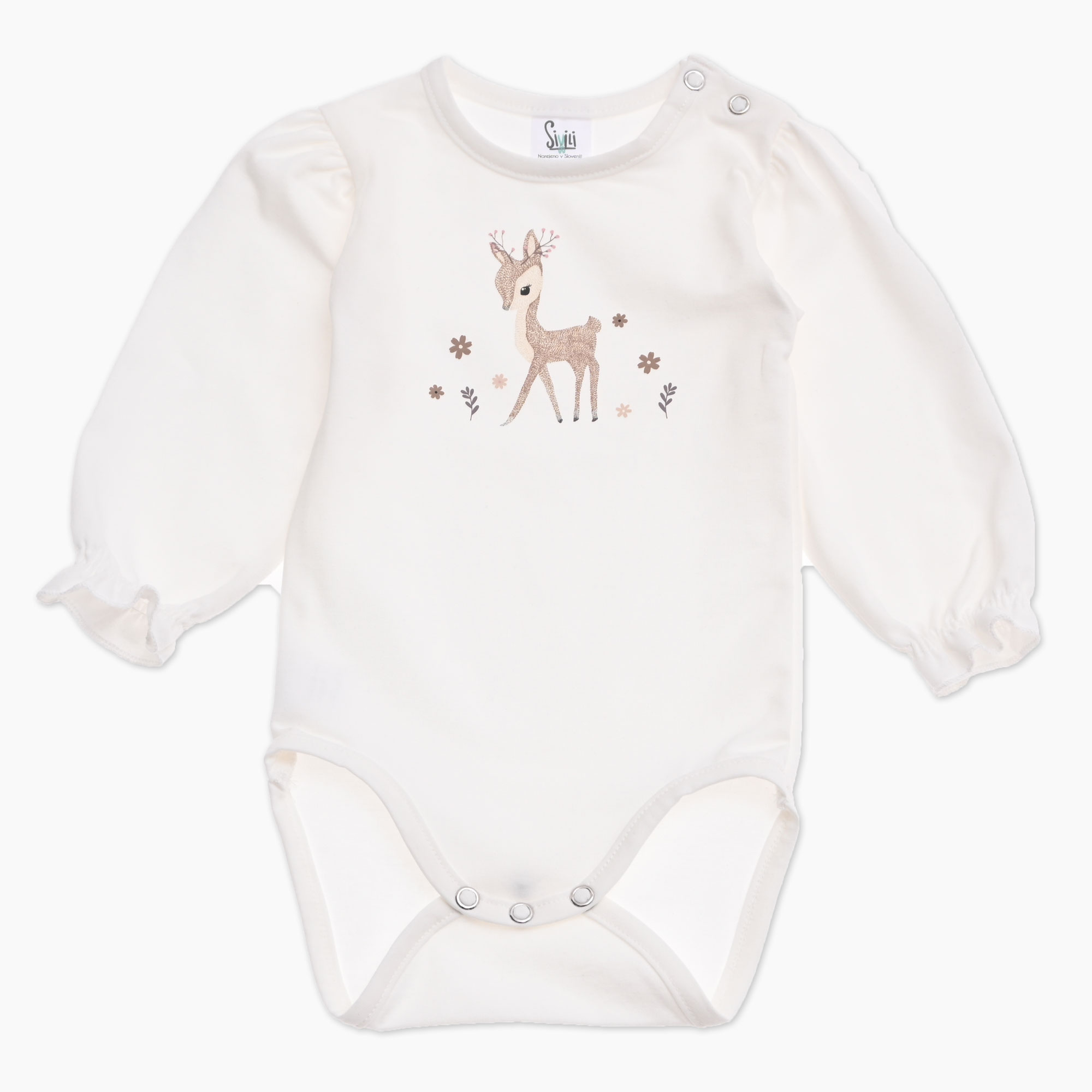 Otroški bodi za punčko v smetana barvi s tiskom srnice in nabranimi rokavčki