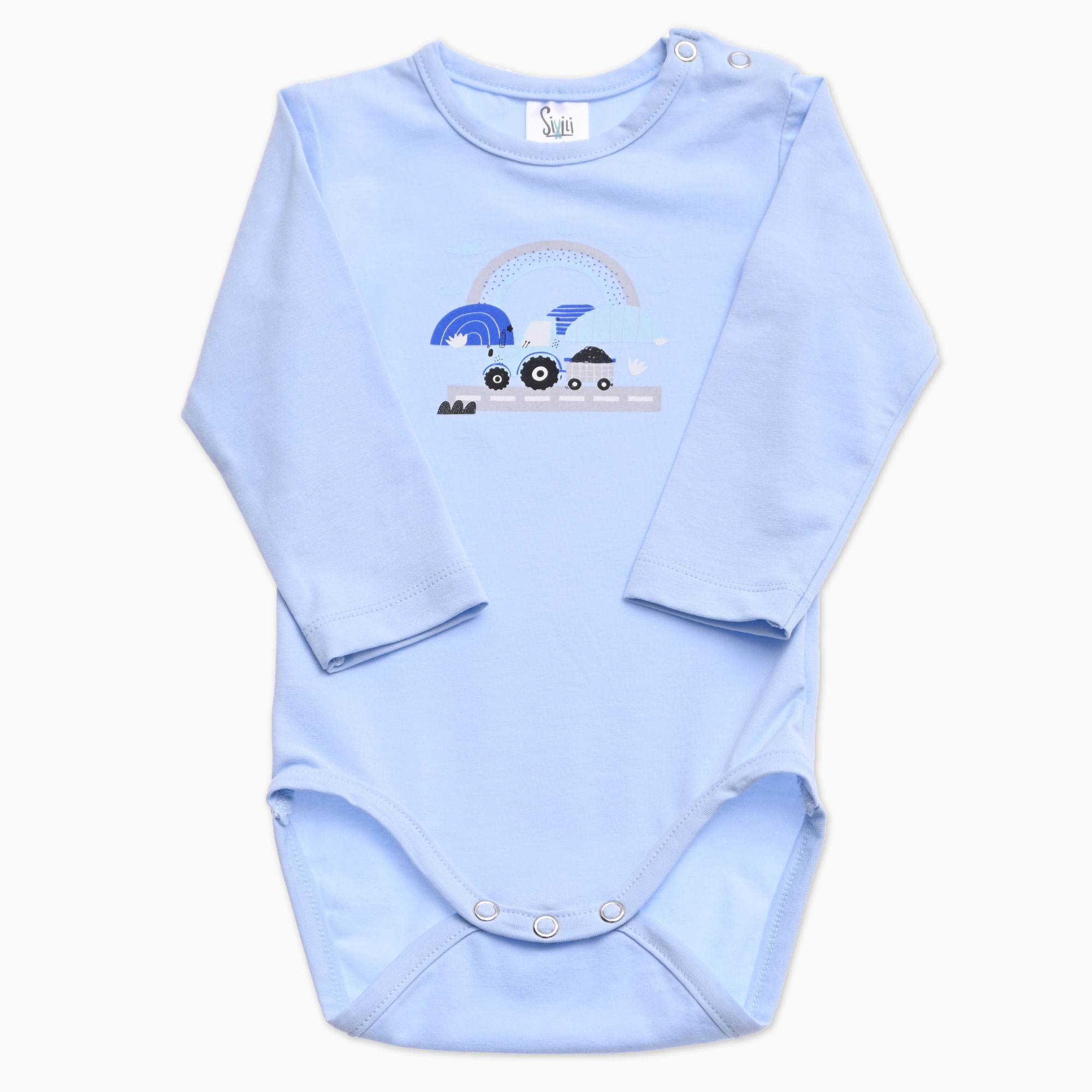 Otroški bodi v svetlo modri barvi s tiskom traktorja in mavrice