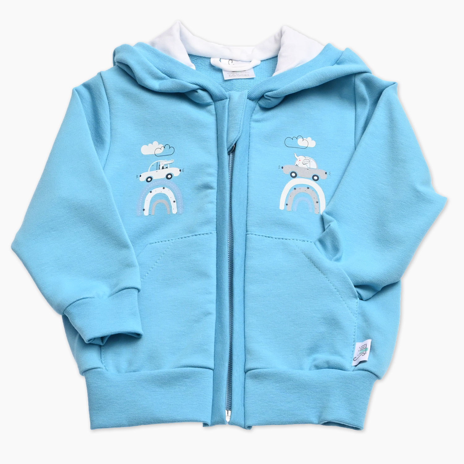 Modra otroška jopica za dojenčka s tiskom avtomobilov na mavrici