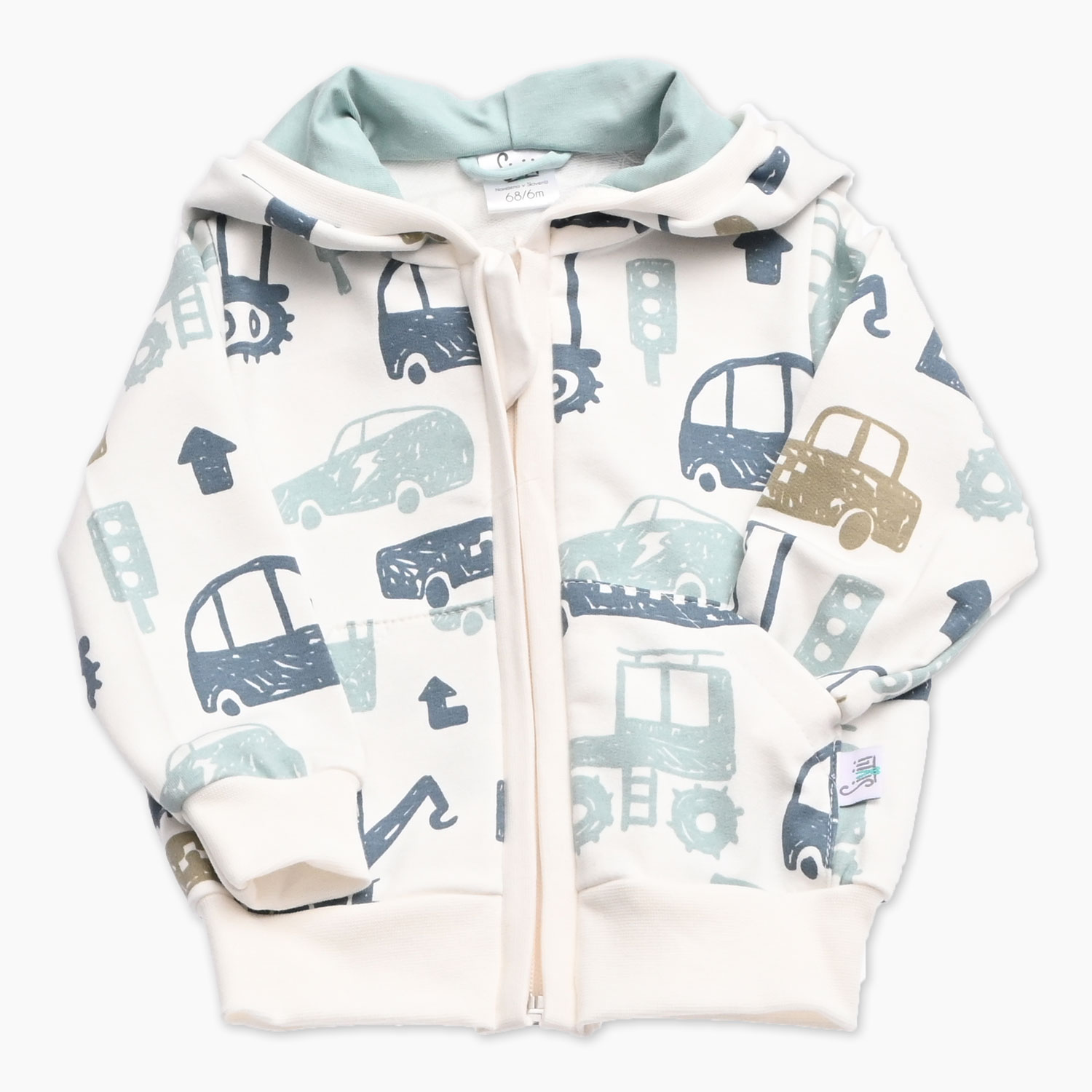 Udobna in praktična otroška jopica za fanta v prijetni smetanasti barvi je popolna izbira za vsakodnevno nošenje. Poživi jo igriv tisk različnih vozil, ki bodo navdušili vse male ljubitelje avtomobilov, tovornjakov in drugih motornih junakov.