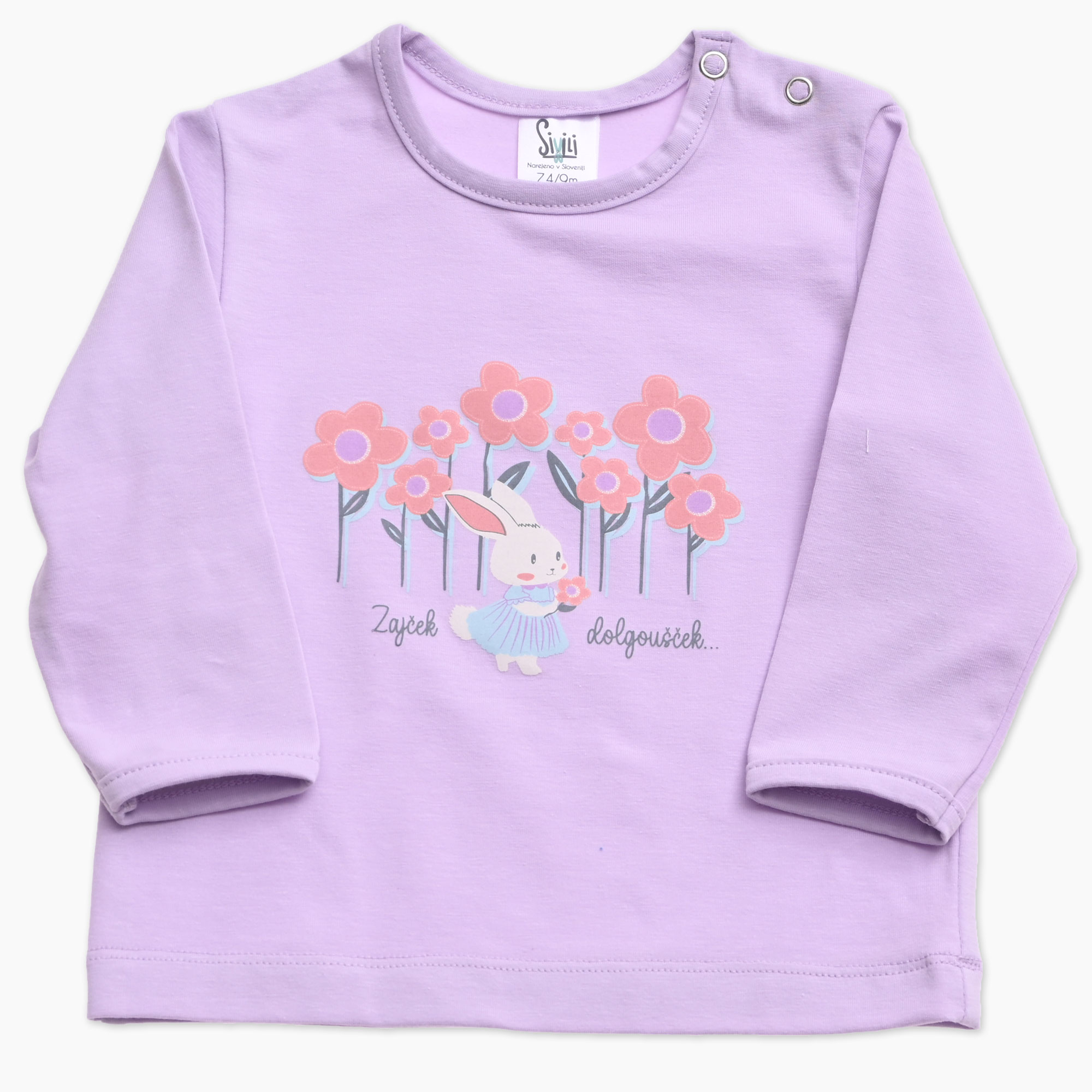 Otroška majica za punčko v lila barvi in tiskom zajčka med rožicami