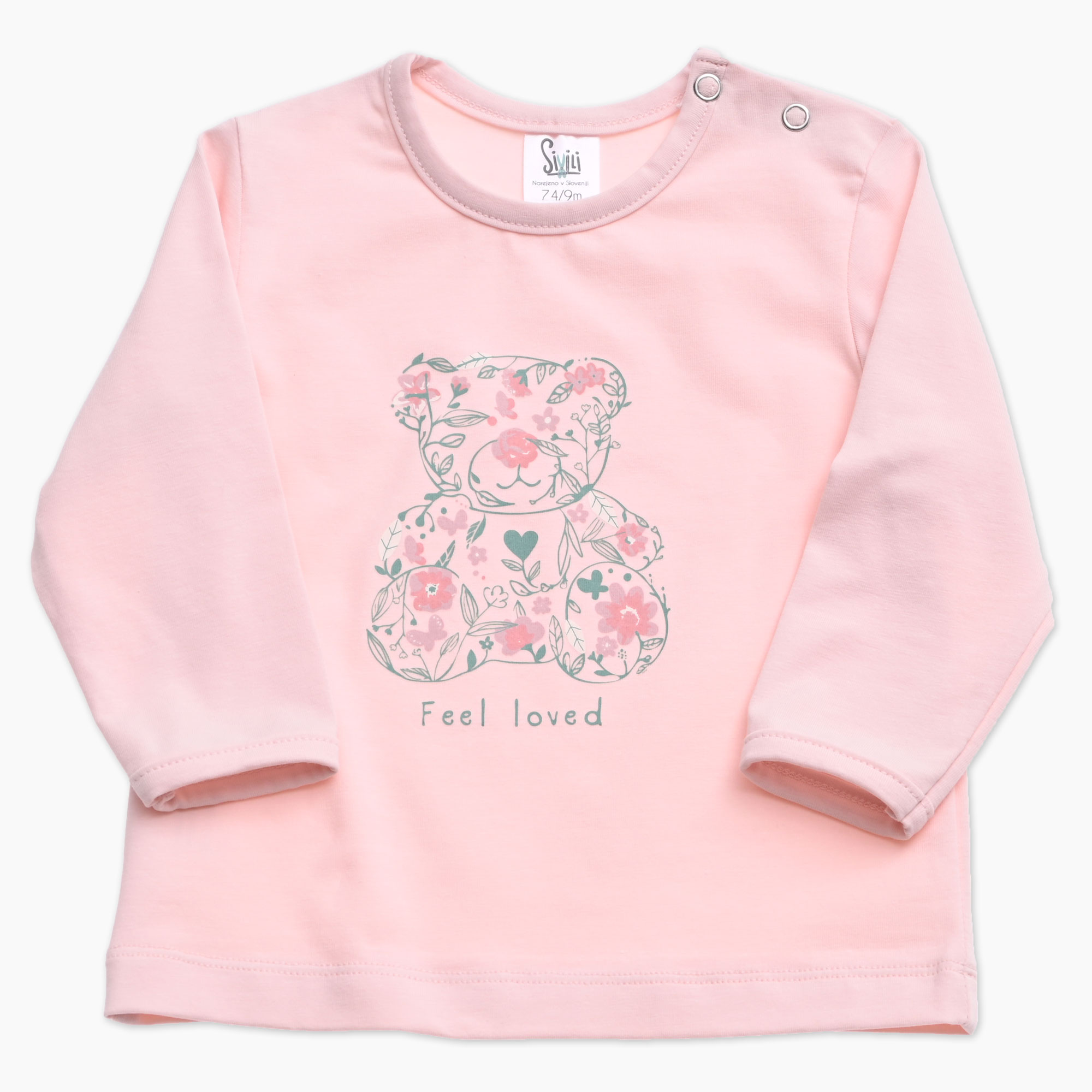 Otroška majica za punčko v roza barvi in tiskom medvedka iz rožic in napisom