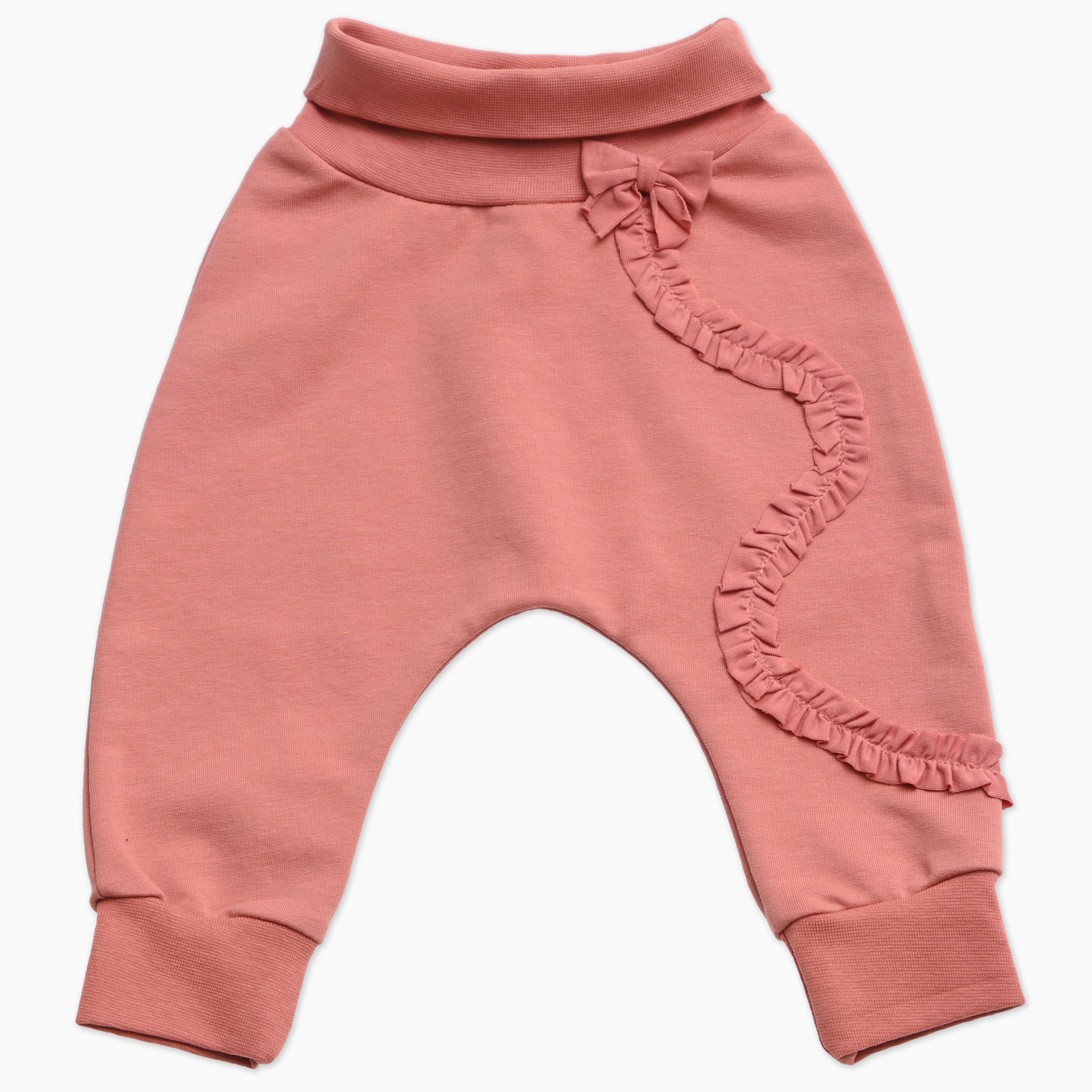 Igrive in udobne baggy hlače za otroka, ki združujejo praktičnost, svobodo gibanja in nežno, otroško estetiko. Sproščen kroj omogoča, da otrok nemoteno raziskuje, se igra in počiva, medtem ko mehki patentni zaključki na pasu in na koncu hlačnic zagotavljajo prijetno prileganje brez tiščanja.
