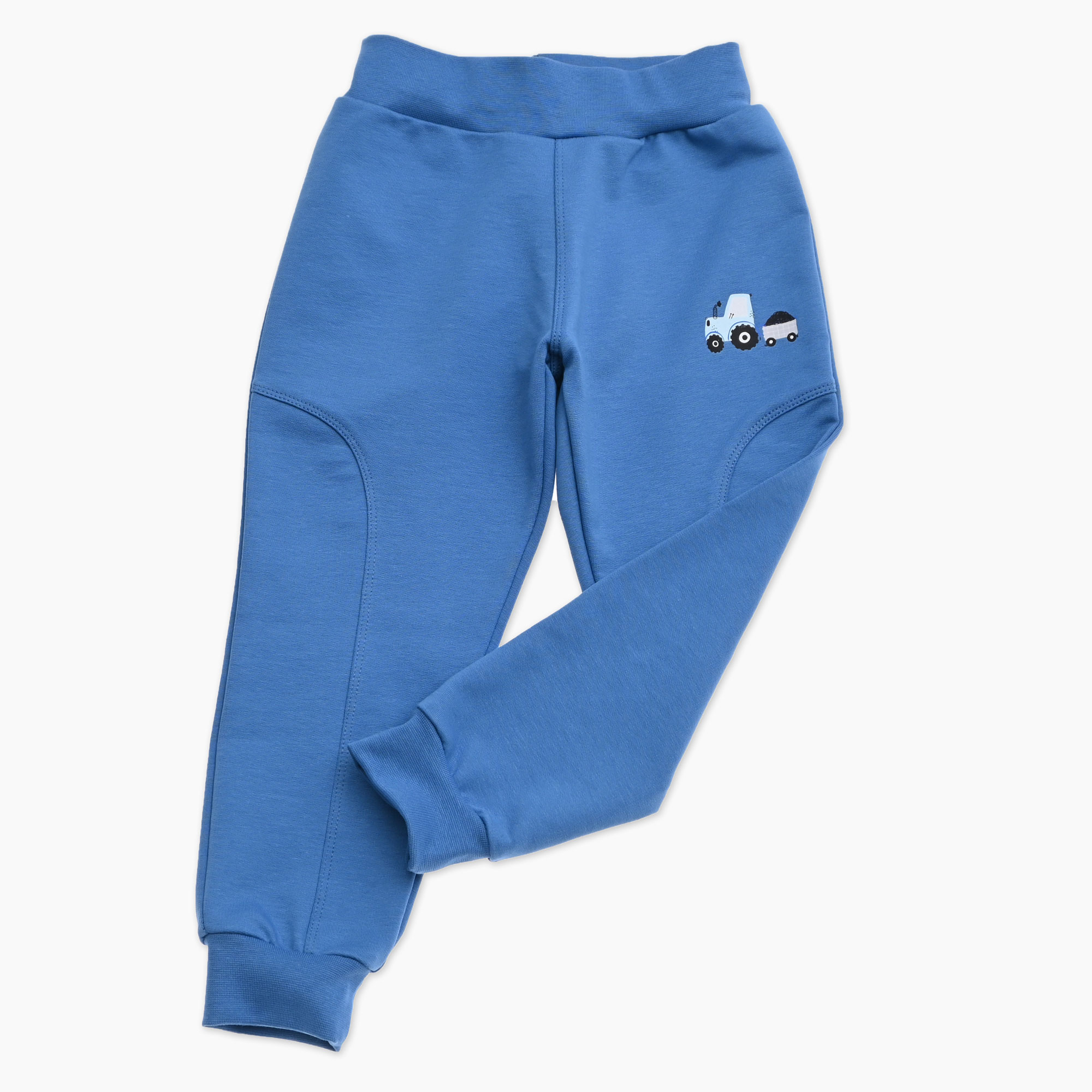 Otroške hlače iz organskega bombaža za fanta v modri barvi in traktorjem s prikolico