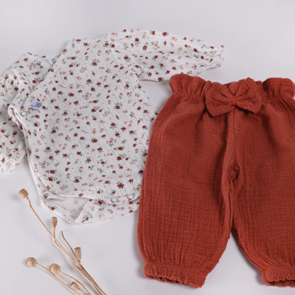 Otroške baggy hlače v topli opečnati barvi so zasnovane za brezskrbne poletne dni, ko sta udobje in svoboda gibanja najpomembnejša. Izdelane so iz mehkega in zračnega muslina iz 100 % bombaža, ki je izjemno prijazen do otroške kože in primeren za tople dni.