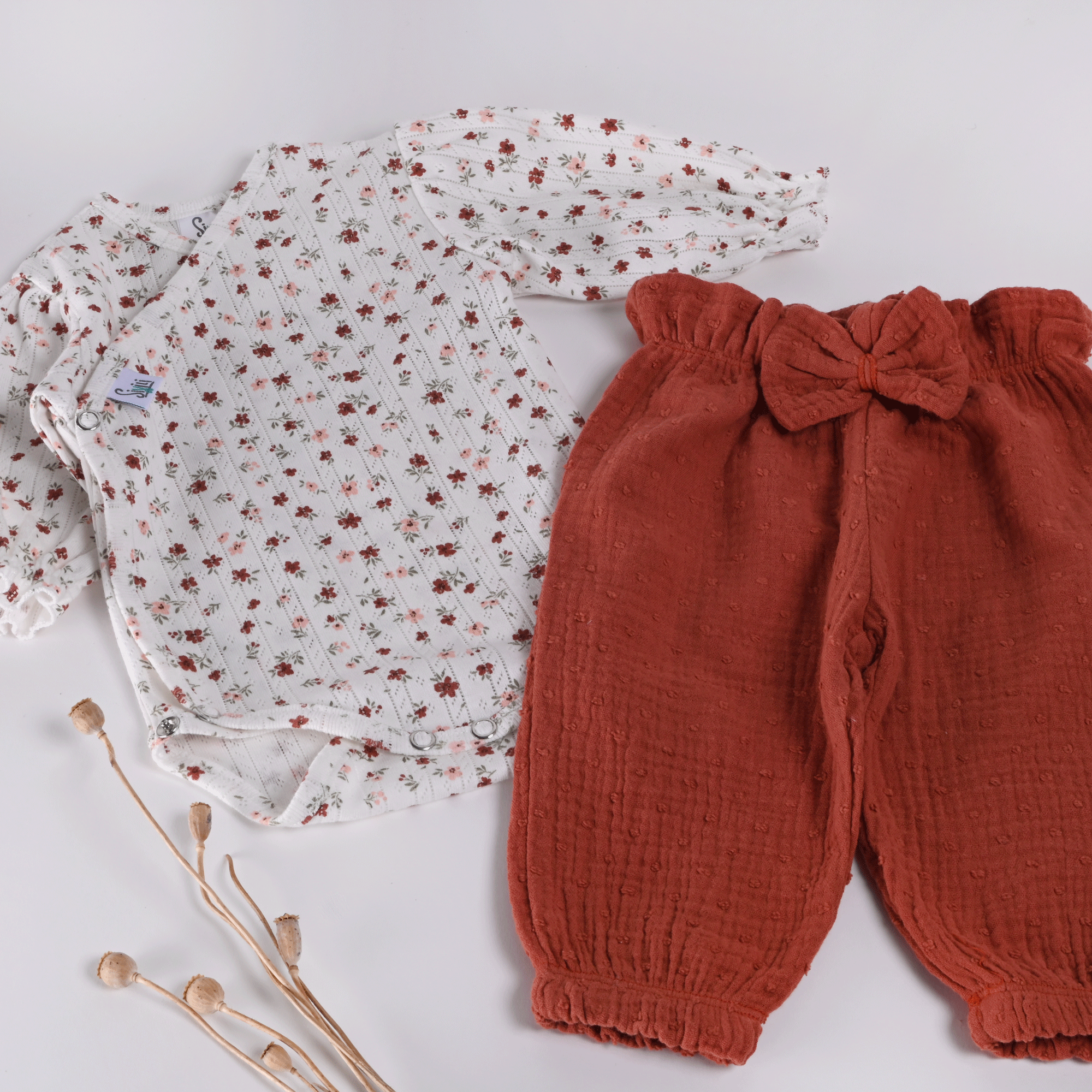 V pasu imajo mehko elastiko, ki se nežno prilagodi trebuščku in ne tišči, dekorativna mašna pa doda nežen, minimalističen videz. Elastika na koncu hlačnic poskrbi, da hlačke ostanejo na mestu in ne zlezejo previsoko, tudi med igro in gibanjem.