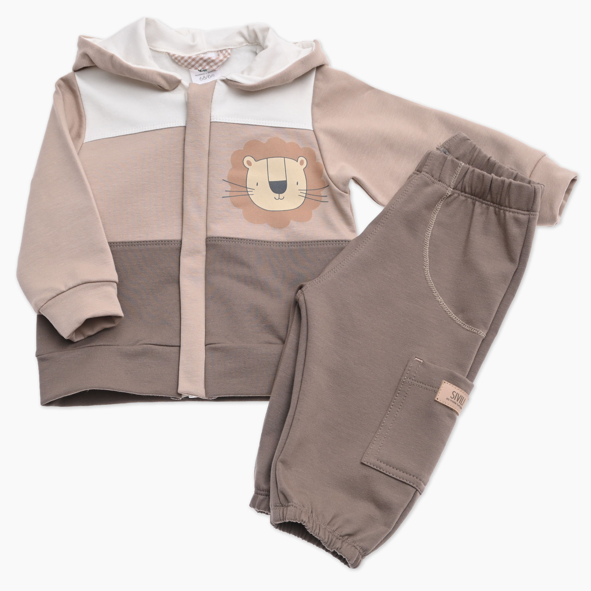 Otroška trenirka za dojenčka v kombinaciji lešnik, smetana in bež barve ter tiskom leva