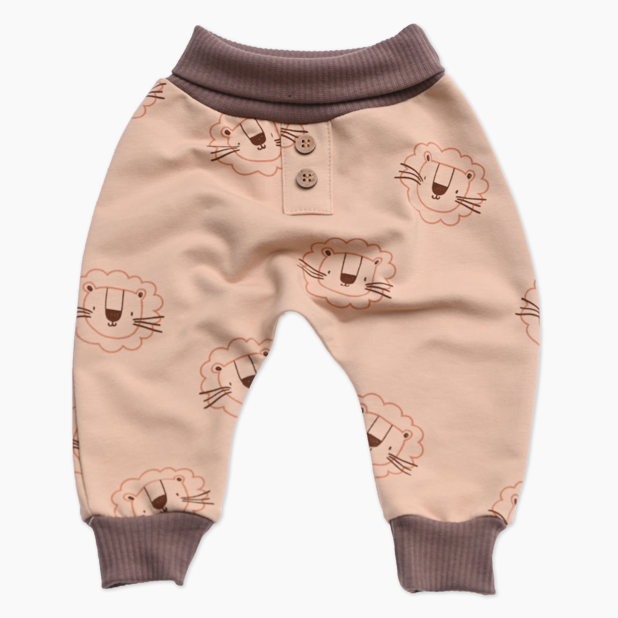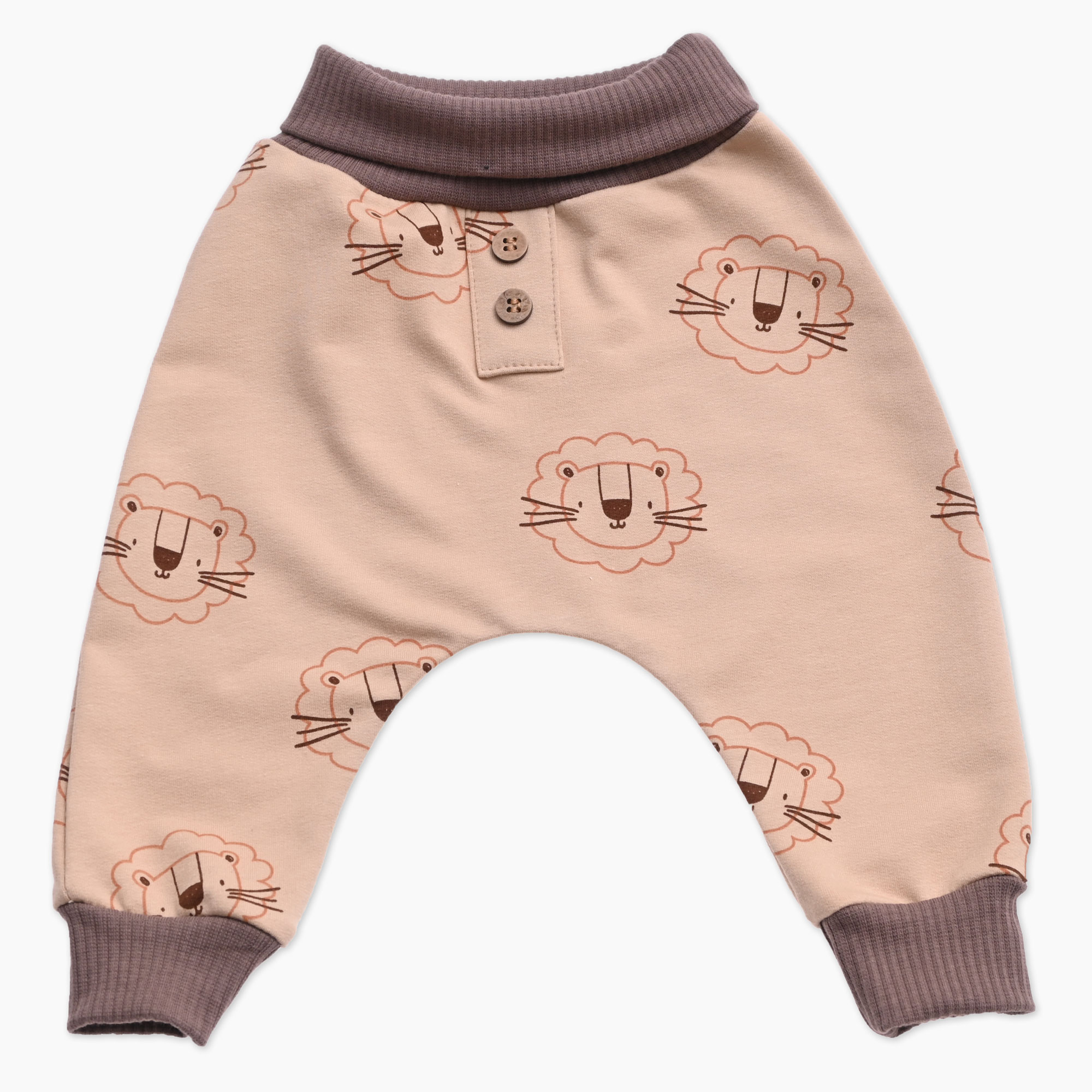 Otroške baggy hlače iz rjave tkanine s tiskom levov