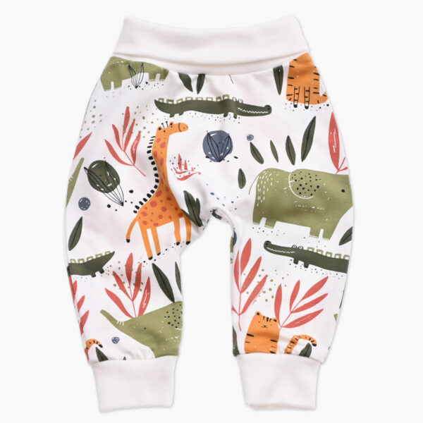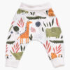 Otroške baggy hlače iz nekoliko tanjše bele tkanine s tiskom žiraf, slonov in krokodilov
