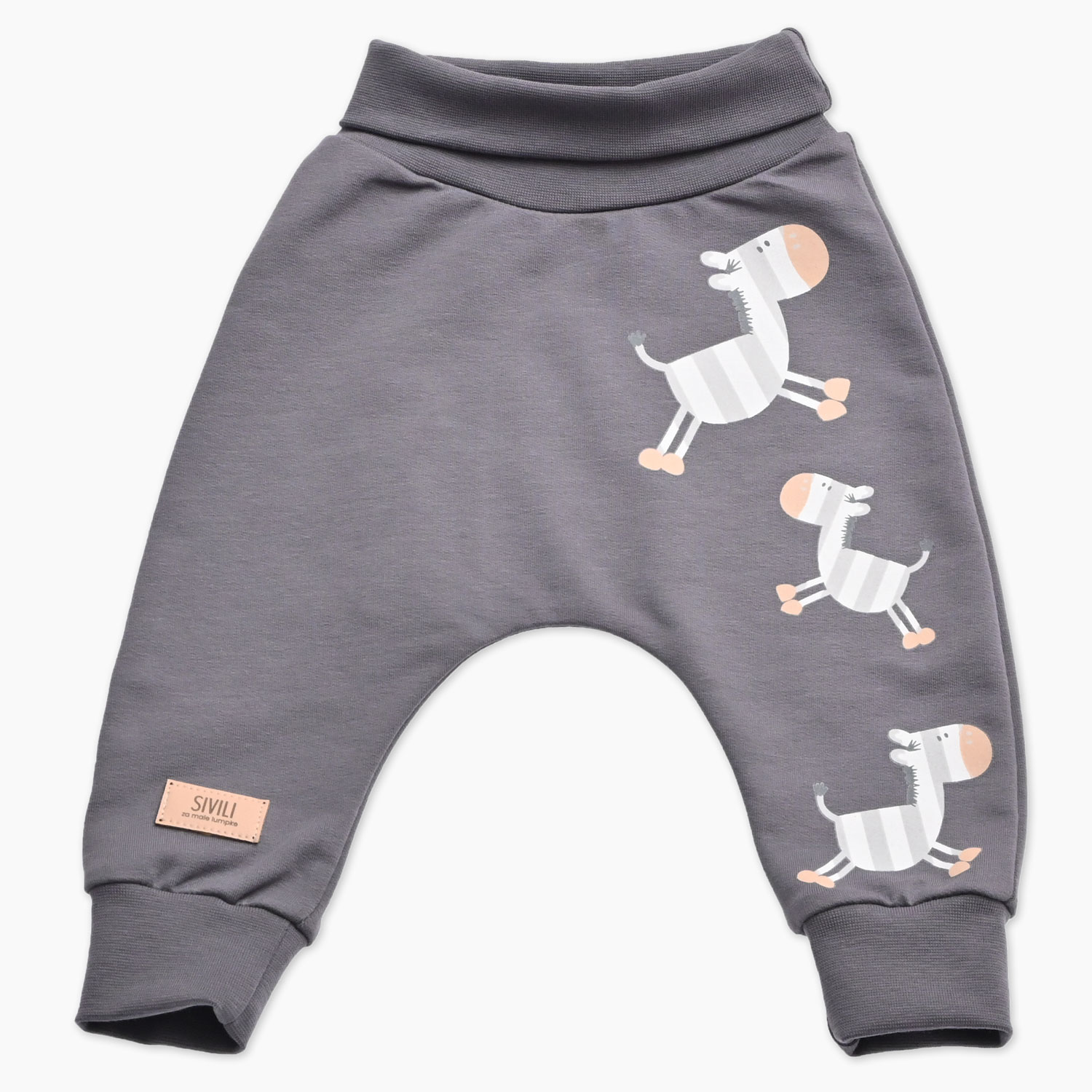 Otroške baggy hlače v sivi barvi s tiskom zebric in našitkom